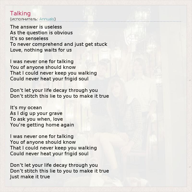 The answer is useless As the question is obvious It's so senseless To never comprehend and just get stuck Love, nothing waits for us I was never one for talking You of anyone should know That I could never keep you walking Could never heat your frigid soul Don't let your life decay through you Don't stitch this lie to you to make it true It's my ocean As I dig up your grave To ask you when, love You're getting home again I was never one for talking You of anyone should know That I could never keep you walking Could never heat your frigid soul Don't let your life decay through you Don't stitch this lie to you to make it true Just make it true
