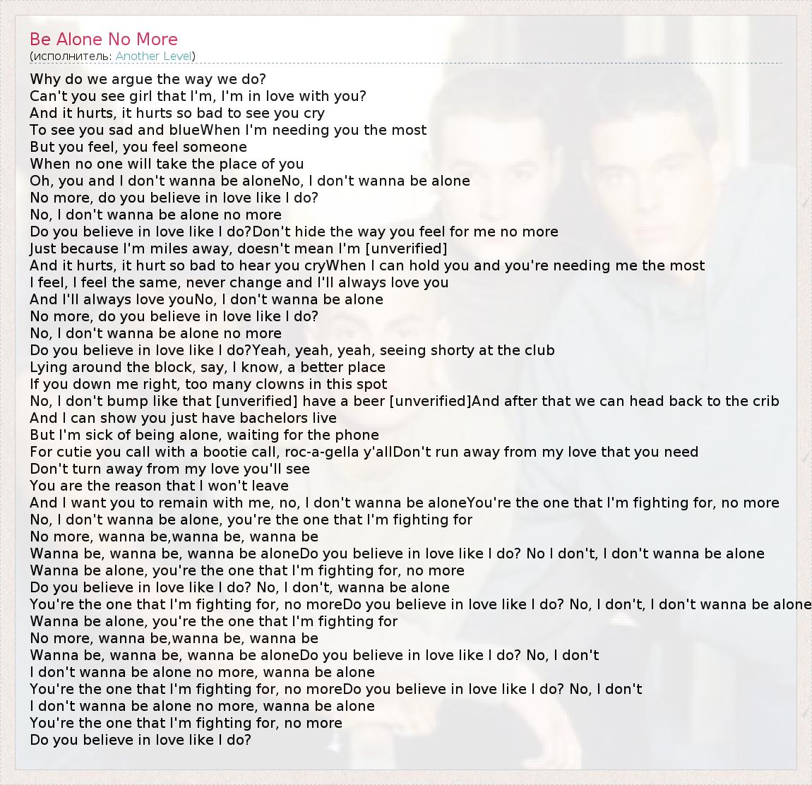 Why do we argue the way we do? Can't you see girl that I'm, I'm in love with you? And it hurts, it hurts so bad to see you cry To see you sad and blueWhen I'm needing you the most But you feel, you feel someone When no one will take the place of you Oh, you and I don't wanna be aloneNo, I don't wanna be alone No more, do you believe in love like I do? No, I don't wanna be alone no more Do you believe in love like I do?Don't hide the way you feel for me no more Just because I'm miles away, doesn't mean I'm [unverified] And it hurts, it hurt so bad to hear you cryWhen I can hold you and you're needing me the most I feel, I feel the same, never change and I'll always love you And I'll always love youNo, I don't wanna be alone No more, do you believe in love like I do? No, I don't wanna be alone no more Do you believe in love like I do?Yeah, yeah, yeah, seeing shorty at the club Lying around the block, say, I know, a better place If you down me right, too many clowns in this spot No, I don't bump like that [unverified] have a beer [unverified]And after that we can head back to the crib And I can show you just have bachelors live But I'm sick of being alone, waiting for the phone For cutie you call with a bootie call, roc-a-gella y'allDon't run away from my love that you need Don't turn away from my love you'll see You are the reason that I won't leave And I want you to remain with me, no, I don't wanna be aloneYou're the one that I'm fighting for, no more No, I don't wanna be alone, you're the one that I'm fighting for No more, wanna be,wanna be, wanna be Wanna be, wanna be, wanna be aloneDo you believe in love like I do? No I don't, I don't wanna be alone Wanna be alone, you're the one that I'm fighting for, no more Do you believe in love like I do? No, I don't, wanna be alone You're the one that I'm fighting for, no moreDo you believe in love like I do? No, I don't, I don't wanna be alone Wanna be alone, you're the one that I'm fighting for No more, wanna be,wanna be, wanna be Wanna be, wanna be, wanna be aloneDo you believe in love like I do? No, I don't I don't wanna be alone no more, wanna be alone You're the one that I'm fighting for, no moreDo you believe in love like I do? No, I don't I don't wanna be alone no more, wanna be alone You're the one that I'm fighting for, no more Do you believe in love like I do?