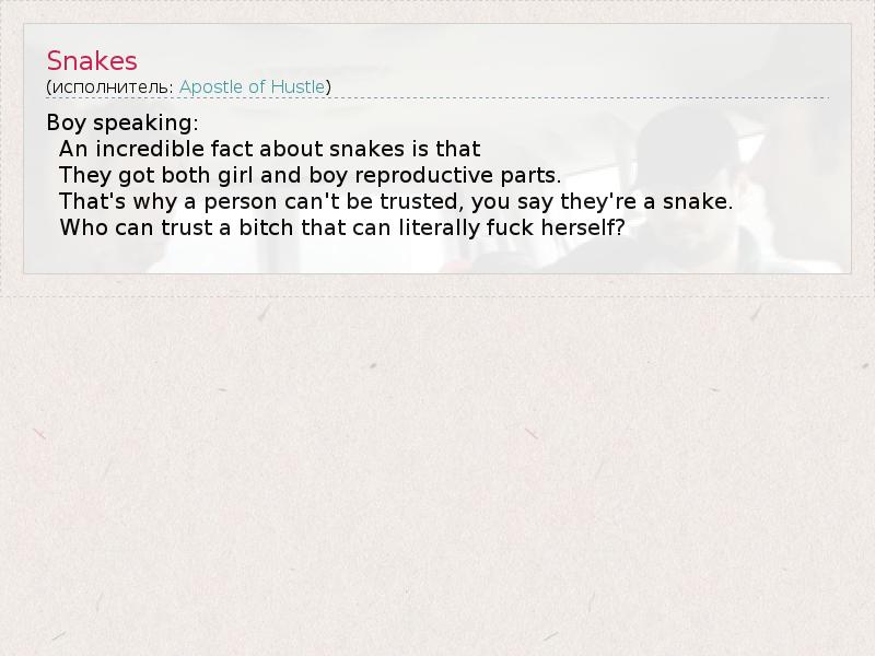 Boy speaking: An incredible fact about snakes is that They got both girl and boy reproductive parts. That's why a person can't be trusted, you say they're a snake. Who can trust a bitch that can literally fuck herself?