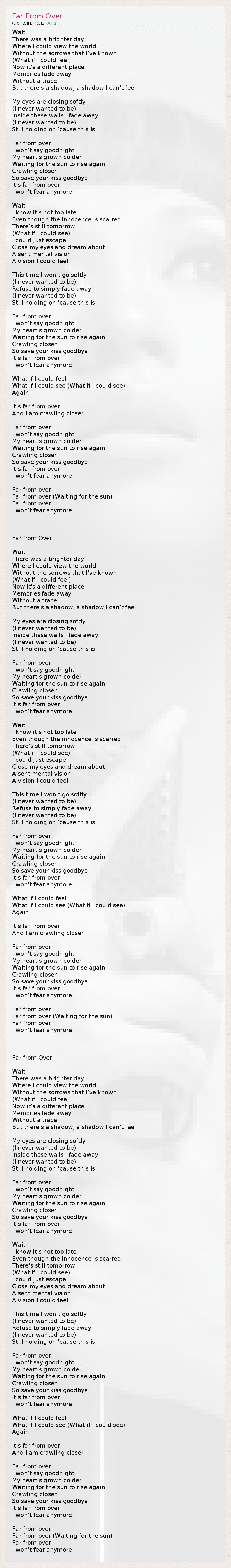 Wait There was a brighter day Where I could view the world Without the sorrows that I've known (What if I could feel) Now it's a different place Memories fade away Without a trace But there's a shadow, a shadow I can't feel My eyes are closing softly (I never wanted to be) Inside these walls I fade away (I never wanted to be) Still holding on 'cause this is Far from over I won't say goodnight My heart's grown colder Waiting for the sun to rise again Crawling closer So save your kiss goodbye It's far from over I won't fear anymore Wait I know it's not too late Even though the innocence is scarred There's still tomorrow (What if I could see) I could just escape Close my eyes and dream about A sentimental vision A vision I could feel This time I won't go softly (I never wanted to be) Refuse to simply fade away (I never wanted to be) Still holding on 'cause this is Far from over I won't say goodnight My heart's grown colder Waiting for the sun to rise again Crawling closer So save your kiss goodbye It's far from over I won't fear anymore What if I could feel What if I could see (What if I could see) Again It's far from over And I am crawling closer Far from over I won't say goodnight My heart's grown colder Waiting for the sun to rise again Crawling closer So save your kiss goodbye It's far from over I won't fear anymore Far from over Far from over (Waiting for the sun) Far from over I won't fear anymore Far from Over Wait There was a brighter day Where I could view the world Without the sorrows that I've known (What if I could feel) Now it's a different place Memories fade away Without a trace But there's a shadow, a shadow I can't feel My eyes are closing softly (I never wanted to be) Inside these walls I fade away (I never wanted to be) Still holding on 'cause this is Far from over I won't say goodnight My heart's grown colder Waiting for the sun to rise again Crawling closer So save your kiss goodbye It's far from over I won't fear anymore Wait I know it's not too late Even though the innocence is scarred There's still tomorrow (What if I could see) I could just escape Close my eyes and dream about A sentimental vision A vision I could feel This time I won't go softly (I never wanted to be) Refuse to simply fade away (I never wanted to be) Still holding on 'cause this is Far from over I won't say goodnight My heart's grown colder Waiting for the sun to rise again Crawling closer So save your kiss goodbye It's far from over I won't fear anymore What if I could feel What if I could see (What if I could see) Again It's far from over And I am crawling closer Far from over I won't say goodnight My heart's grown colder Waiting for the sun to rise again Crawling closer So save your kiss goodbye It's far from over I won't fear anymore Far from over Far from over (Waiting for the sun) Far from over I won't fear anymore Far from Over Wait There was a brighter day Where I could view the world Without the sorrows that I've known (What if I could feel) Now it's a different place Memories fade away Without a trace But there's a shadow, a shadow I can't feel My eyes are closing softly (I never wanted to be) Inside these walls I fade away (I never wanted to be) Still holding on 'cause this is Far from over I won't say goodnight My heart's grown colder Waiting for the sun to rise again Crawling closer So save your kiss goodbye It's far from over I won't fear anymore Wait I know it's not too late Even though the innocence is scarred There's still tomorrow (What if I could see) I could just escape Close my eyes and dream about A sentimental vision A vision I could feel This time I won't go softly (I never wanted to be) Refuse to simply fade away (I never wanted to be) Still holding on 'cause this is Far from over I won't say goodnight My heart's grown colder Waiting for the sun to rise again Crawling closer So save your kiss goodbye It's far from over I won't fear anymore What if I could feel What if I could see (What if I could see) Again It's far from over And I am crawling closer Far from over I won't say goodnight My heart's grown colder Waiting for the sun to rise again Crawling closer So save your kiss goodbye It's far from over I won't fear anymore Far from over Far from over (Waiting for the sun) Far from over I won't fear anymore