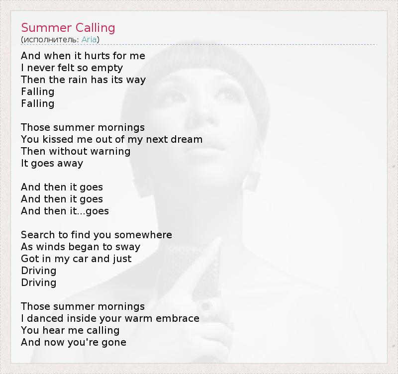 And when it hurts for me I never felt so empty Then the rain has its way Falling Falling Those summer mornings You kissed me out of my next dream Then without warning It goes away And then it goes And then it goes And then it...goes Search to find you somewhere As winds began to sway Got in my car and just Driving Driving Those summer mornings I danced inside your warm embrace You hear me calling And now you're gone