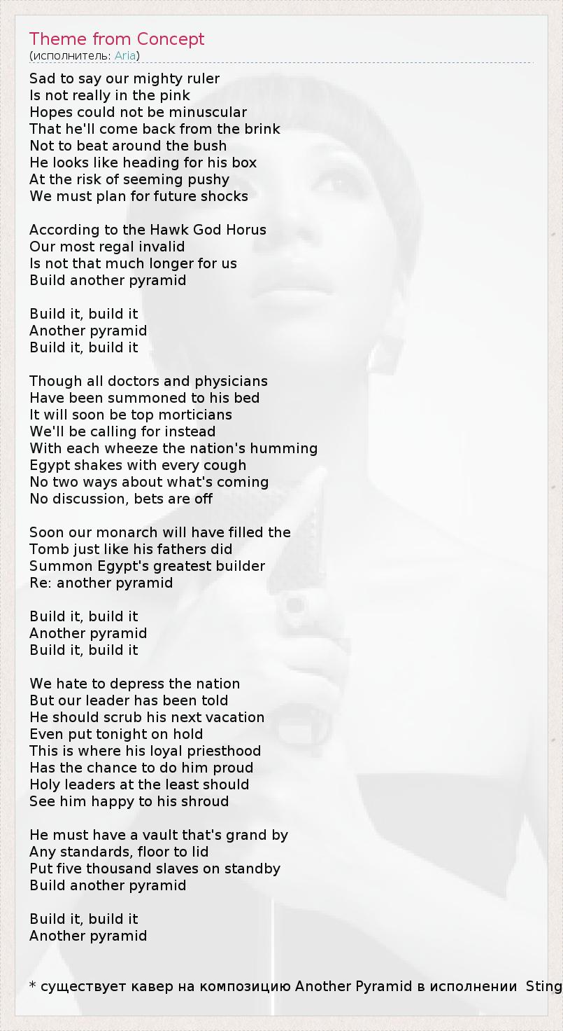 Sad to say our mighty ruler Is not really in the pink Hopes could not be minuscular That he'll come back from the brink Not to beat around the bush He looks like heading for his box At the risk of seeming pushy We must plan for future shocks According to the Hawk God Horus Our most regal invalid Is not that much longer for us Build another pyramid Build it, build it Another pyramid Build it, build it Though all doctors and physicians Have been summoned to his bed It will soon be top morticians We'll be calling for instead With each wheeze the nation's humming Egypt shakes with every cough No two ways about what's coming No discussion, bets are off Soon our monarch will have filled the Tomb just like his fathers did Summon Egypt's greatest builder Re: another pyramid Build it, build it Another pyramid Build it, build it We hate to depress the nation But our leader has been told He should scrub his next vacation Even put tonight on hold This is where his loyal priesthood Has the chance to do him proud Holy leaders at the least should See him happy to his shroud He must have a vault that's grand by Any standards, floor to lid Put five thousand slaves on standby Build another pyramid Build it, build it Another pyramid * существует кавер на композицию Another Pyramid в исполнении Sting