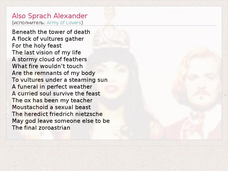 А как ты думаешь, о чем песня "Also Sprach Alexander" ?