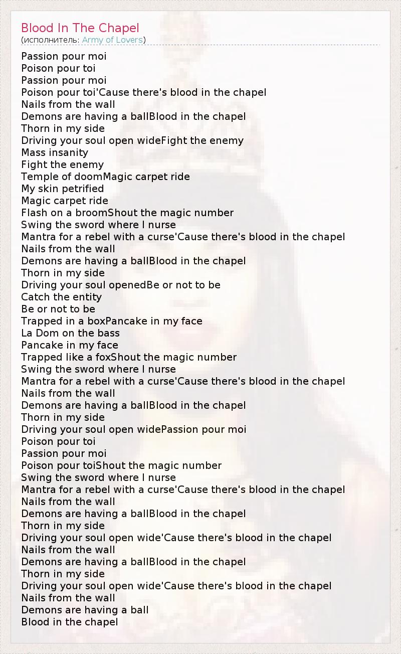 Passion pour moi Poison pour toi Passion pour moi Poison pour toi'Cause there's blood in the chapel Nails from the wall Demons are having a ballBlood in the chapel Thorn in my side Driving your soul open wideFight the enemy Mass insanity Fight the enemy Temple of doomMagic carpet ride My skin petrified Magic carpet ride Flash on a broomShout the magic number Swing the sword where I nurse Mantra for a rebel with a curse'Cause there's blood in the chapel Nails from the wall Demons are having a ballBlood in the chapel Thorn in my side Driving your soul openedBe or not to be Catch the entity Be or not to be Trapped in a boxPancake in my face La Dom on the bass Pancake in my face Trapped like a foxShout the magic number Swing the sword where I nurse Mantra for a rebel with a curse'Cause there's blood in the chapel Nails from the wall Demons are having a ballBlood in the chapel Thorn in my side Driving your soul open widePassion pour moi Poison pour toi Passion pour moi Poison pour toiShout the magic number Swing the sword where I nurse Mantra for a rebel with a curse'Cause there's blood in the chapel Nails from the wall Demons are having a ballBlood in the chapel Thorn in my side Driving your soul open wide'Cause there's blood in the chapel Nails from the wall Demons are having a ballBlood in the chapel Thorn in my side Driving your soul open wide'Cause there's blood in the chapel Nails from the wall Demons are having a ball Blood in the chapel