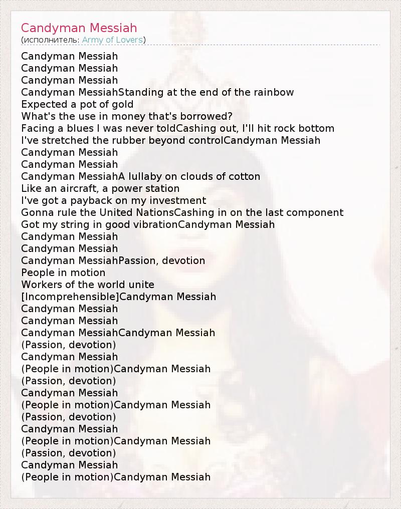 Candyman Messiah Candyman Messiah Candyman Messiah Candyman MessiahStanding at the end of the rainbow Expected a pot of gold What's the use in money that's borrowed? Facing a blues I was never toldCashing out, I'll hit rock bottom I've stretched the rubber beyond controlCandyman Messiah Candyman Messiah Candyman Messiah Candyman MessiahA lullaby on clouds of cotton Like an aircraft, a power station I've got a payback on my investment Gonna rule the United NationsCashing in on the last component Got my string in good vibrationCandyman Messiah Candyman Messiah Candyman Messiah Candyman MessiahPassion, devotion People in motion Workers of the world unite [Incomprehensible]Candyman Messiah Candyman Messiah Candyman Messiah Candyman MessiahCandyman Messiah (Passion, devotion) Candyman Messiah (People in motion)Candyman Messiah (Passion, devotion) Candyman Messiah (People in motion)Candyman Messiah (Passion, devotion) Candyman Messiah (People in motion)Candyman Messiah (Passion, devotion) Candyman Messiah (People in motion)Candyman Messiah