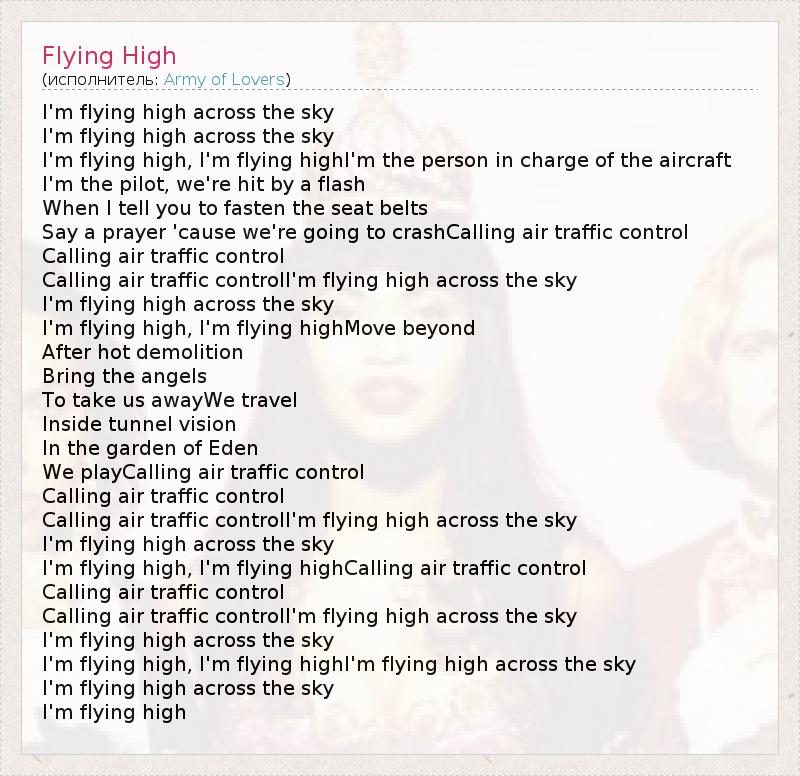 I'm flying high across the sky I'm flying high across the sky I'm flying high, I'm flying highI'm the person in charge of the aircraft I'm the pilot, we're hit by a flash When I tell you to fasten the seat belts Say a prayer 'cause we're going to crashCalling air traffic control Calling air traffic control Calling air traffic controlI'm flying high across the sky I'm flying high across the sky I'm flying high, I'm flying highMove beyond After hot demolition Bring the angels To take us awayWe travel Inside tunnel vision In the garden of Eden We playCalling air traffic control Calling air traffic control Calling air traffic controlI'm flying high across the sky I'm flying high across the sky I'm flying high, I'm flying highCalling air traffic control Calling air traffic control Calling air traffic controlI'm flying high across the sky I'm flying high across the sky I'm flying high, I'm flying highI'm flying high across the sky I'm flying high across the sky I'm flying high