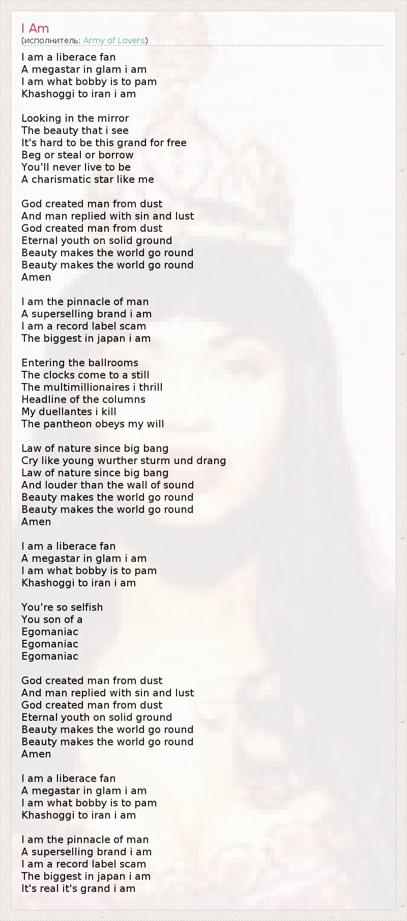 I am a liberace fan A megastar in glam i am I am what bobby is to pam Khashoggi to iran i am Looking in the mirror The beauty that i see It's hard to be this grand for free Beg or steal or borrow You'll never live to be A charismatic star like me God created man from dust And man replied with sin and lust God created man from dust Eternal youth on solid ground Beauty makes the world go round Beauty makes the world go round Amen I am the pinnacle of man A superselling brand i am I am a record label scam The biggest in japan i am Entering the ballrooms The clocks come to a still The multimillionaires i thrill Headline of the columns My duellantes i kill The pantheon obeys my will Law of nature since big bang Cry like young wurther sturm und drang Law of nature since big bang And louder than the wall of sound Beauty makes the world go round Beauty makes the world go round Amen I am a liberace fan A megastar in glam i am I am what bobby is to pam Khashoggi to iran i am You're so selfish You son of a Egomaniac Egomaniac Egomaniac God created man from dust And man replied with sin and lust God created man from dust Eternal youth on solid ground Beauty makes the world go round Beauty makes the world go round Amen I am a liberace fan A megastar in glam i am I am what bobby is to pam Khashoggi to iran i am I am the pinnacle of man A superselling brand i am I am a record label scam The biggest in japan i am It's real it's grand i am