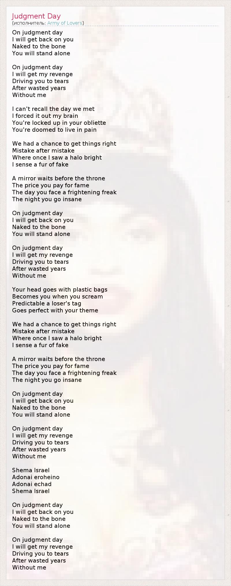 On judgment day I will get back on you Naked to the bone You will stand alone On judgment day I will get my revenge Driving you to tears After wasted years Without me I can't recall the day we met I forced it out my brain You're locked up in your obliette You're doomed to live in pain We had a chance to get things right Mistake after mistake Where once I saw a halo bright I sense a fur of fake A mirror waits before the throne The price you pay for fame The day you face a frightening freak The night you go insane On judgment day I will get back on you Naked to the bone You will stand alone On judgment day I will get my revenge Driving you to tears After wasted years Without me Your head goes with plastic bags Becomes you when you scream Predictable a loser's tag Goes perfect with your theme We had a chance to get things right Mistake after mistake Where once I saw a halo bright I sense a fur of fake A mirror waits before the throne The price you pay for fame The day you face a frightening freak The night you go insane On judgment day I will get back on you Naked to the bone You will stand alone On judgment day I will get my revenge Driving you to tears After wasted years Without me Shema Israel Adonai eroheino Adonai echad Shema Israel On judgment day I will get back on you Naked to the bone You will stand alone On judgment day I will get my revenge Driving you to tears After wasted years Without me