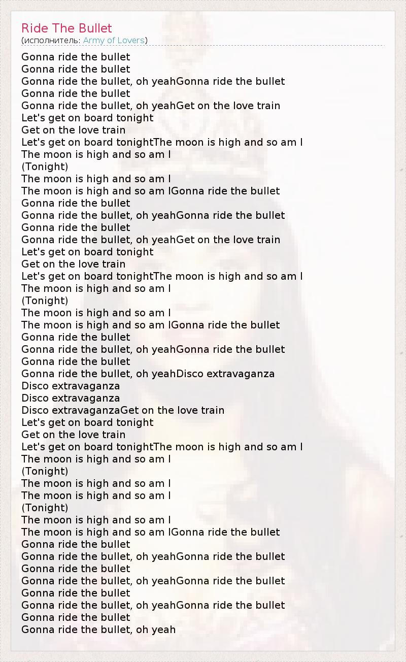 Gonna ride the bullet Gonna ride the bullet Gonna ride the bullet, oh yeahGonna ride the bullet Gonna ride the bullet Gonna ride the bullet, oh yeahGet on the love train Let's get on board tonight Get on the love train Let's get on board tonightThe moon is high and so am I The moon is high and so am I (Tonight) The moon is high and so am I The moon is high and so am IGonna ride the bullet Gonna ride the bullet Gonna ride the bullet, oh yeahGonna ride the bullet Gonna ride the bullet Gonna ride the bullet, oh yeahGet on the love train Let's get on board tonight Get on the love train Let's get on board tonightThe moon is high and so am I The moon is high and so am I (Tonight) The moon is high and so am I The moon is high and so am IGonna ride the bullet Gonna ride the bullet Gonna ride the bullet, oh yeahGonna ride the bullet Gonna ride the bullet Gonna ride the bullet, oh yeahDisco extravaganza Disco extravaganza Disco extravaganza Disco extravaganzaGet on the love train Let's get on board tonight Get on the love train Let's get on board tonightThe moon is high and so am I The moon is high and so am I (Tonight) The moon is high and so am I The moon is high and so am I (Tonight) The moon is high and so am I The moon is high and so am IGonna ride the bullet Gonna ride the bullet Gonna ride the bullet, oh yeahGonna ride the bullet Gonna ride the bullet Gonna ride the bullet, oh yeahGonna ride the bullet Gonna ride the bullet Gonna ride the bullet, oh yeahGonna ride the bullet Gonna ride the bullet Gonna ride the bullet, oh yeah
