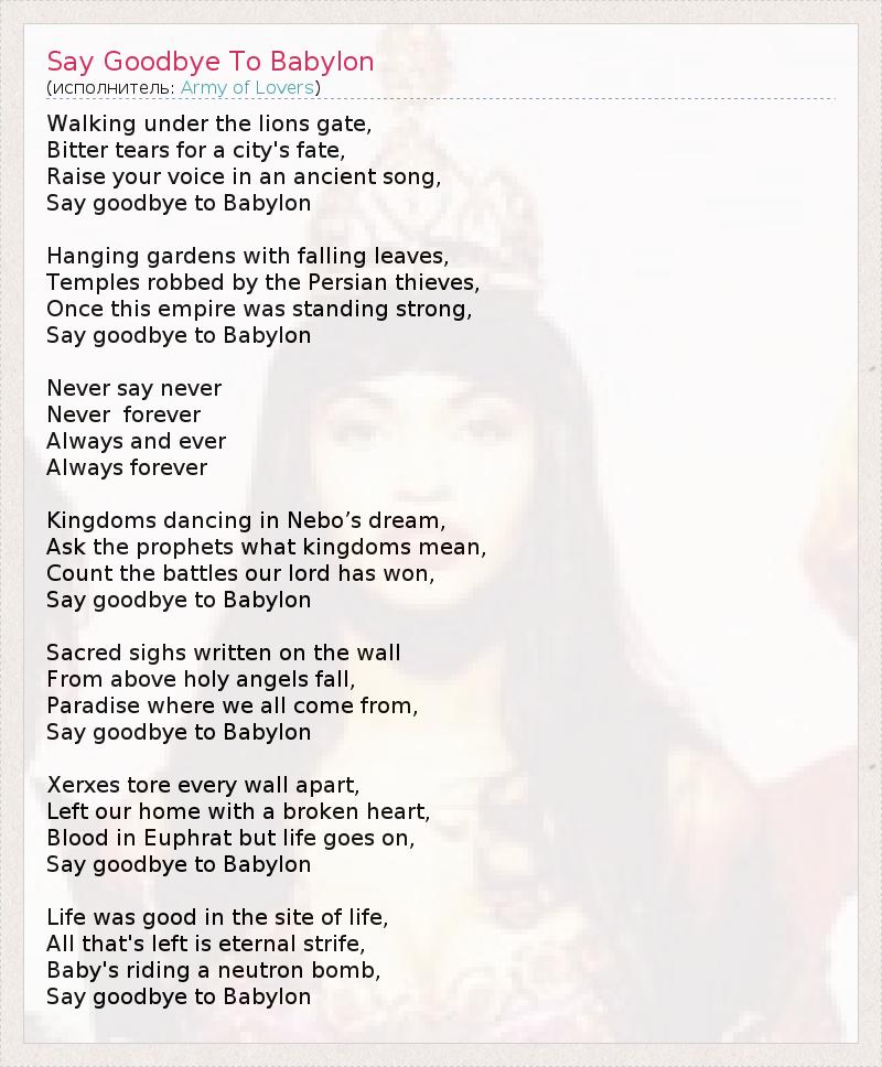 Проходя под львиными вратами - Символом горьких слез о судьбе города - Спой эту древнюю песню И скажите "Прощай" Вавилону Висячие сады с падающими листьями, Храмы ограблены грабителями из Персии, Некогда это была очень сильная империя, Скажи "Прощай" Вавилону Никогда не говори никогда Никогда и навсегда Всегда и навечно Всегда и навсегда Царства пляшут в мечте Небуса, Спросите пророков, что за королевства, Посчитайте сражения, что выиграл ваш правитель Прощай, мой Вавилон... Священные знаки написаны на стене, Пали ангелы вниз с небес, Рая, откуда мы все приходим, Попрощайся с Вавилоном Ксеркс разрушил каждую стену, С разбитым сердцем уезжали мы из своих домов, Кровь в Евфрате – но жизнь продолжается, Прощай, мой Вавилон Жизнь была чудесна в этом месте, Всё, что осталось, - вечная борьба, Дитя верхом на нейтронной бомбе, Прощай, мой Вавилон…