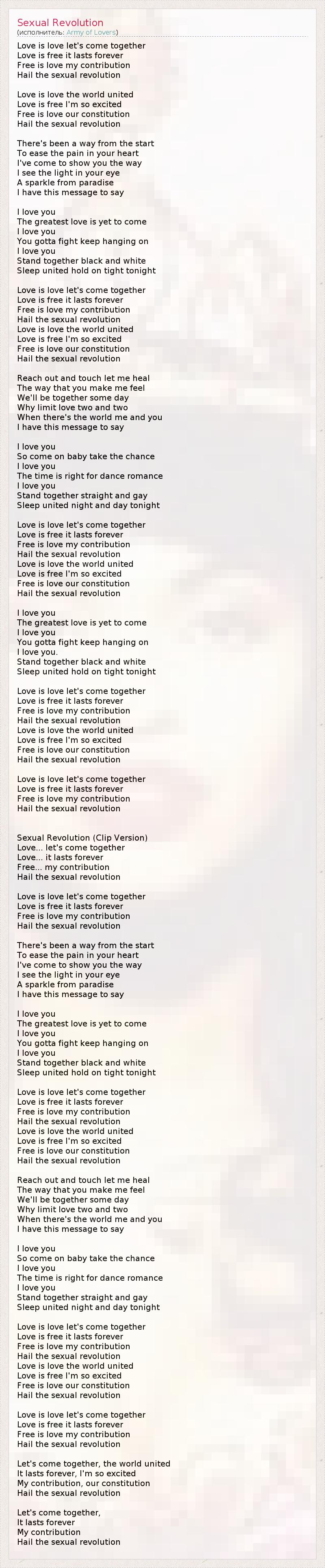 Love is love let's come together Love is free it lasts forever Free is love my contribution Hail the sexual revolution Love is love the world united Love is free I'm so excited Free is love our constitution Hail the sexual revolution There's been a way from the start To ease the pain in your heart I've come to show you the way I see the light in your eye A sparkle from paradise I have this message to say I love you The greatest love is yet to come I love you You gotta fight keep hanging on I love you Stand together black and white Sleep united hold on tight tonight Love is love let's come together Love is free it lasts forever Free is love my contribution Hail the sexual revolution Love is love the world united Love is free I'm so excited Free is love our constitution Hail the sexual revolution Reach out and touch let me heal The way that you make me feel We'll be together some day Why limit love two and two When there's the world me and you I have this message to say I love you So come on baby take the chance I love you The time is right for dance romance I love you Stand together straight and gay Sleep united night and day tonight Love is love let's come together Love is free it lasts forever Free is love my contribution Hail the sexual revolution Love is love the world united Love is free I'm so excited Free is love our constitution Hail the sexual revolution I love you The greatest love is yet to come I love you You gotta fight keep hanging on I love you. Stand together black and white Sleep united hold on tight tonight Love is love let's come together Love is free it lasts forever Free is love my contribution Hail the sexual revolution Love is love the world united Love is free I'm so excited Free is love our constitution Hail the sexual revolution Love is love let's come together Love is free it lasts forever Free is love my contribution Hail the sexual revolution Sexual Revolution (Clip Version) Love... let's come together Love... it lasts forever Free... my contribution Hail the sexual revolution Love is love let's come together Love is free it lasts forever Free is love my contribution Hail the sexual revolution There's been a way from the start To ease the pain in your heart I've come to show you the way I see the light in your eye A sparkle from paradise I have this message to say I love you The greatest love is yet to come I love you You gotta fight keep hanging on I love you Stand together black and white Sleep united hold on tight tonight Love is love let's come together Love is free it lasts forever Free is love my contribution Hail the sexual revolution Love is love the world united Love is free I'm so excited Free is love our constitution Hail the sexual revolution Reach out and touch let me heal The way that you make me feel We'll be together some day Why limit love two and two When there's the world me and you I have this message to say I love you So come on baby take the chance I love you The time is right for dance romance I love you Stand together straight and gay Sleep united night and day tonight Love is love let's come together Love is free it lasts forever Free is love my contribution Hail the sexual revolution Love is love the world united Love is free I'm so excited Free is love our constitution Hail the sexual revolution Love is love let's come together Love is free it lasts forever Free is love my contribution Hail the sexual revolution Let's come together, the world united It lasts forever, I'm so excited My contribution, our constitution Hail the sexual revolution Let's come together, It lasts forever My contribution Hail the sexual revolution
