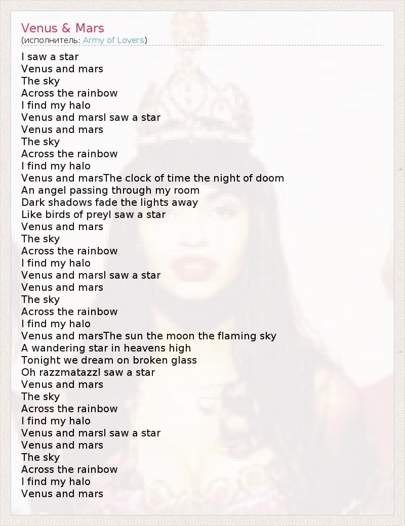 I saw a star Venus and mars The sky Across the rainbow I find my halo Venus and marsI saw a star Venus and mars The sky Across the rainbow I find my halo Venus and marsThe clock of time the night of doom An angel passing through my room Dark shadows fade the lights away Like birds of preyI saw a star Venus and mars The sky Across the rainbow I find my halo Venus and marsI saw a star Venus and mars The sky Across the rainbow I find my halo Venus and marsThe sun the moon the flaming sky A wandering star in heavens high Tonight we dream on broken glass Oh razzmatazzI saw a star Venus and mars The sky Across the rainbow I find my halo Venus and marsI saw a star Venus and mars The sky Across the rainbow I find my halo Venus and mars