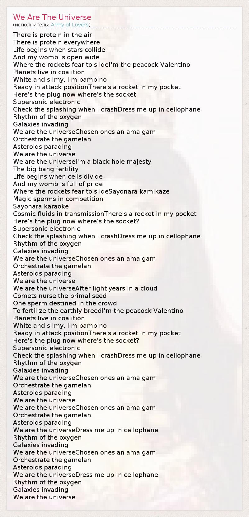 There is protein in the air There is protein everywhere Life begins when stars collide And my womb is open wide Where the rockets fear to slideI'm the peacock Valentino Planets live in coalition White and slimy, I'm bambino Ready in attack positionThere's a rocket in my pocket Here's the plug now where's the socket Supersonic electronic Check the splashing when I crashDress me up in cellophane Rhythm of the oxygen Galaxies invading We are the universeChosen ones an amalgam Orchestrate the gamelan Asteroids parading We are the universe We are the universeI'm a black hole majesty The big bang fertility Life begins when cells divide And my womb is full of pride Where the rockets fear to slideSayonara kamikaze Magic sperms in competition Sayonara karaoke Cosmic fluids in transmissionThere's a rocket in my pocket Here's the plug now where's the socket? Supersonic electronic Check the splashing when I crashDress me up in cellophane Rhythm of the oxygen Galaxies invading We are the universeChosen ones an amalgam Orchestrate the gamelan Asteroids parading We are the universe We are the universeAfter light years in a cloud Comets nurse the primal seed One sperm destined in the crowd To fertilize the earthly breedI'm the peacock Valentino Planets live in coalition White and slimy, I'm bambino Ready in attack positionThere's a rocket in my pocket Here's the plug now where's the socket? Supersonic electronic Check the splashing when I crashDress me up in cellophane Rhythm of the oxygen Galaxies invading We are the universeChosen ones an amalgam Orchestrate the gamelan Asteroids parading We are the universe We are the universeChosen ones an amalgam Orchestrate the gamelan Asteroids parading We are the universeDress me up in cellophane Rhythm of the oxygen Galaxies invading We are the universeChosen ones an amalgam Orchestrate the gamelan Asteroids parading We are the universeDress me up in cellophane Rhythm of the oxygen Galaxies invading We are the universe