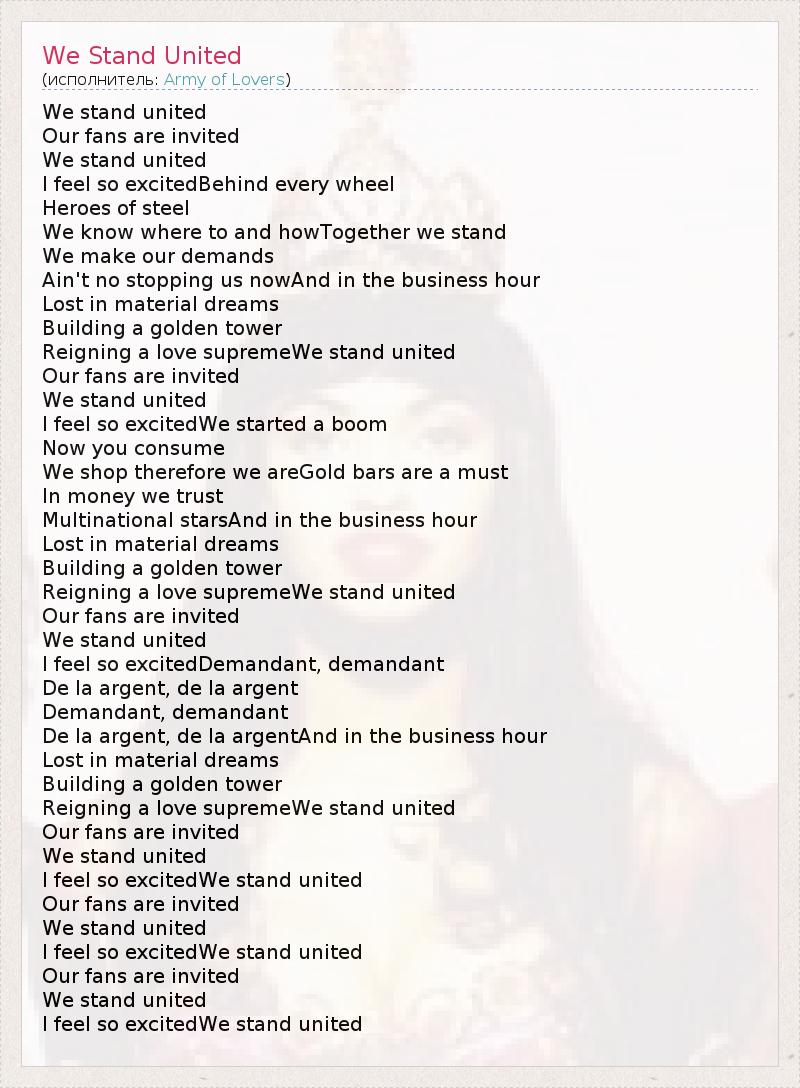 We stand united Our fans are invited We stand united I feel so excitedBehind every wheel Heroes of steel We know where to and howTogether we stand We make our demands Ain't no stopping us nowAnd in the business hour Lost in material dreams Building a golden tower Reigning a love supremeWe stand united Our fans are invited We stand united I feel so excitedWe started a boom Now you consume We shop therefore we areGold bars are a must In money we trust Multinational starsAnd in the business hour Lost in material dreams Building a golden tower Reigning a love supremeWe stand united Our fans are invited We stand united I feel so excitedDemandant, demandant De la argent, de la argent Demandant, demandant De la argent, de la argentAnd in the business hour Lost in material dreams Building a golden tower Reigning a love supremeWe stand united Our fans are invited We stand united I feel so excitedWe stand united Our fans are invited We stand united I feel so excitedWe stand united Our fans are invited We stand united I feel so excitedWe stand united