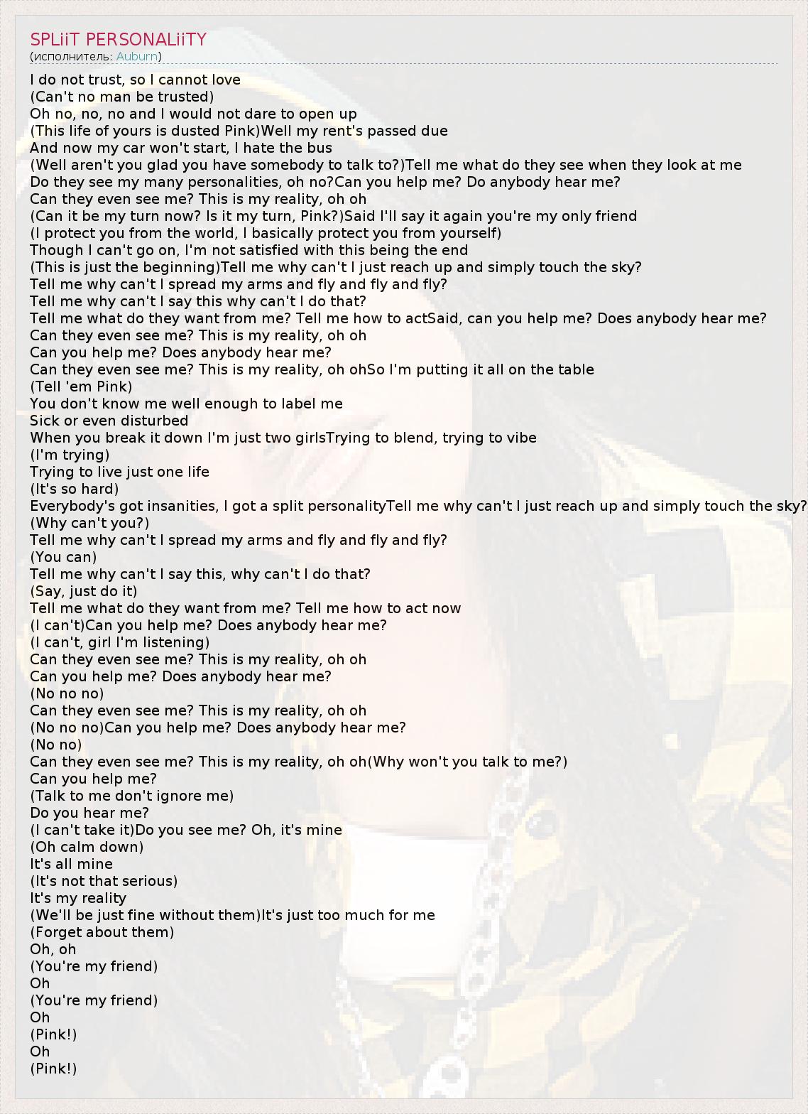 I do not trust, so I cannot love (Can't no man be trusted) Oh no, no, no and I would not dare to open up (This life of yours is dusted Pink)Well my rent's passed due And now my car won't start, I hate the bus (Well aren't you glad you have somebody to talk to?)Tell me what do they see when they look at me Do they see my many personalities, oh no?Can you help me? Do anybody hear me? Can they even see me? This is my reality, oh oh (Can it be my turn now? Is it my turn, Pink?)Said I'll say it again you're my only friend (I protect you from the world, I basically protect you from yourself) Though I can't go on, I'm not satisfied with this being the end (This is just the beginning)Tell me why can't I just reach up and simply touch the sky? Tell me why can't I spread my arms and fly and fly and fly? Tell me why can't I say this why can't I do that? Tell me what do they want from me? Tell me how to actSaid, can you help me? Does anybody hear me? Can they even see me? This is my reality, oh oh Can you help me? Does anybody hear me? Can they even see me? This is my reality, oh ohSo I'm putting it all on the table (Tell 'em Pink) You don't know me well enough to label me Sick or even disturbed When you break it down I'm just two girlsTrying to blend, trying to vibe (I'm trying) Trying to live just one life (It's so hard) Everybody's got insanities, I got a split personalityTell me why can't I just reach up and simply touch the sky? (Why can't you?) Tell me why can't I spread my arms and fly and fly and fly? (You can) Tell me why can't I say this, why can't I do that? (Say, just do it) Tell me what do they want from me? Tell me how to act now (I can't)Can you help me? Does anybody hear me? (I can't, girl I'm listening) Can they even see me? This is my reality, oh oh Can you help me? Does anybody hear me? (No no no) Can they even see me? This is my reality, oh oh (No no no)Can you help me? Does anybody hear me? (No no) Can they even see me? This is my reality, oh oh(Why won't you talk to me?) Can you help me? (Talk to me don't ignore me) Do you hear me? (I can't take it)Do you see me? Oh, it's mine (Oh calm down) It's all mine (It's not that serious) It's my reality (We'll be just fine without them)It's just too much for me (Forget about them) Oh, oh (You're my friend) Oh (You're my friend) Oh (Pink!) Oh (Pink!)