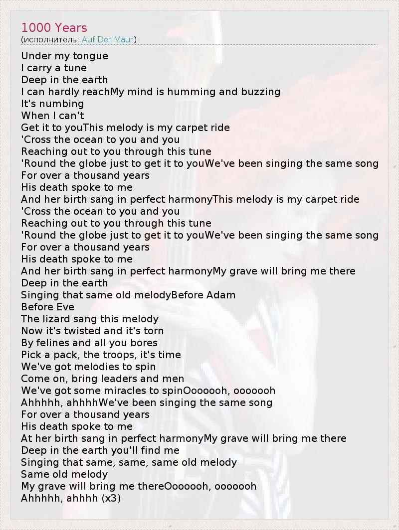Under my tongue I carry a tune Deep in the earth I can hardly reachMy mind is humming and buzzing It's numbing When I can't Get it to youThis melody is my carpet ride 'Cross the ocean to you and you Reaching out to you through this tune 'Round the globe just to get it to youWe've been singing the same song For over a thousand years His death spoke to me And her birth sang in perfect harmonyThis melody is my carpet ride 'Cross the ocean to you and you Reaching out to you through this tune 'Round the globe just to get it to youWe've been singing the same song For over a thousand years His death spoke to me And her birth sang in perfect harmonyMy grave will bring me there Deep in the earth Singing that same old melodyBefore Adam Before Eve The lizard sang this melody Now it's twisted and it's torn By felines and all you bores Pick a pack, the troops, it's time We've got melodies to spin Come on, bring leaders and men We've got some miracles to spinOoooooh, ooooooh Ahhhhh, ahhhhWe've been singing the same song For over a thousand years His death spoke to me At her birth sang in perfect harmonyMy grave will bring me there Deep in the earth you'll find me Singing that same, same, same old melody Same old melody My grave will bring me thereOoooooh, ooooooh Ahhhhh, ahhhh (x3)