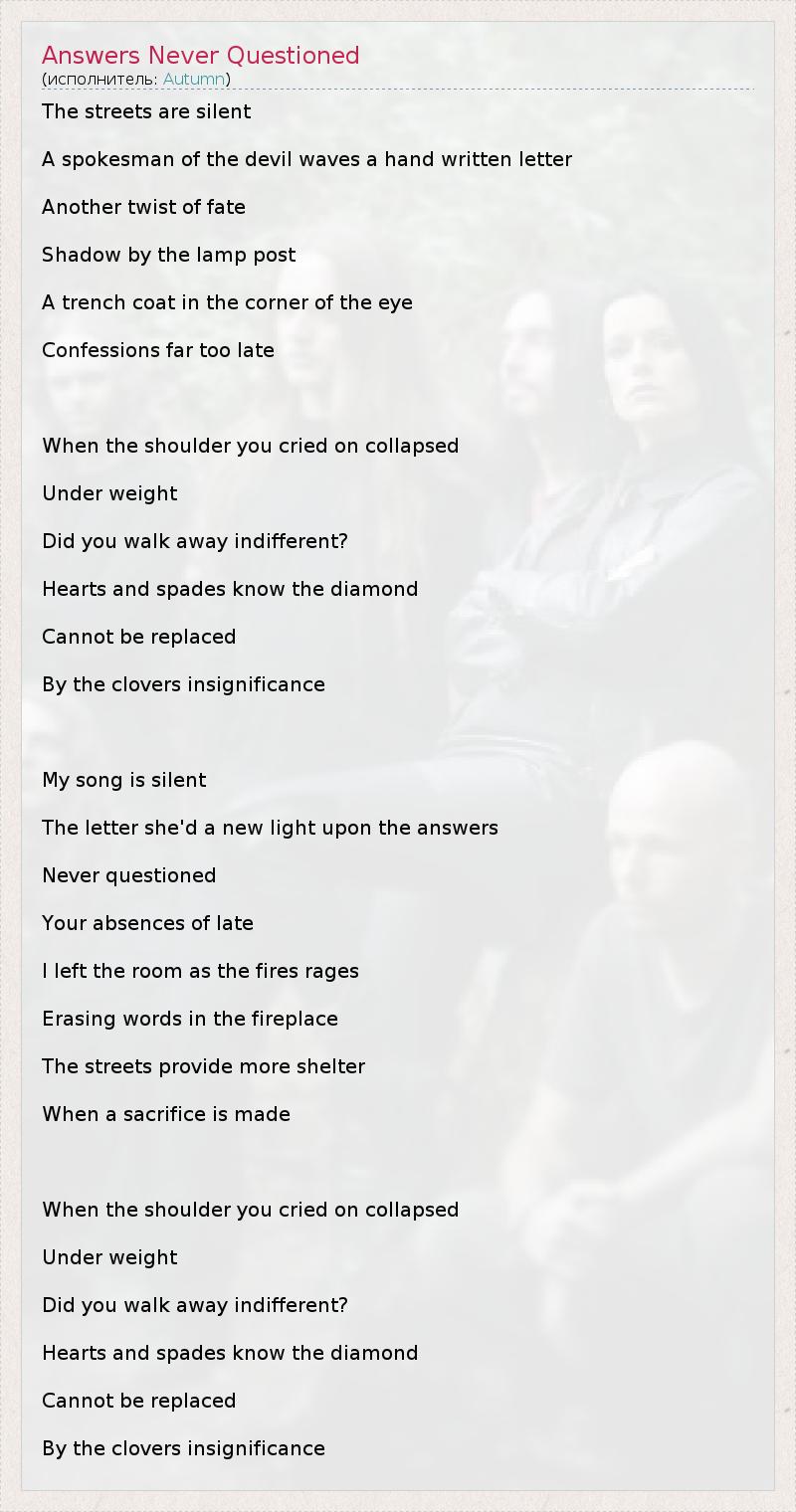 А как ты думаешь, о чем песня "Answers Never Questioned" ?