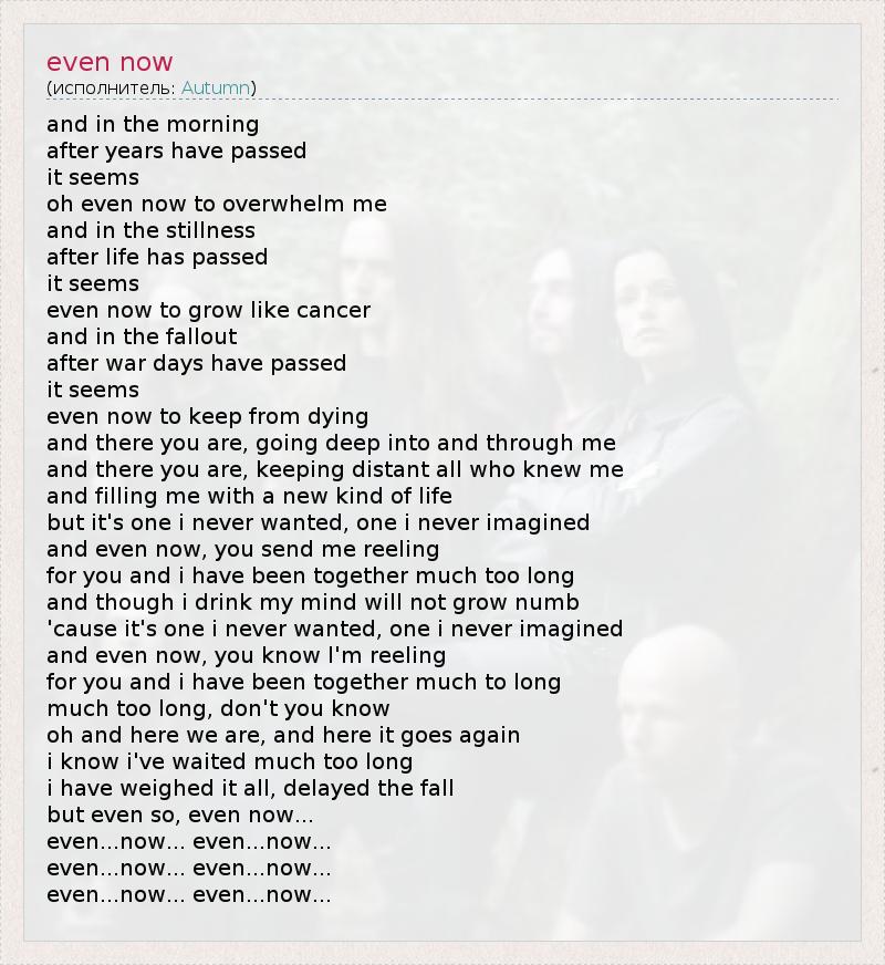 and in the morning after years have passed it seems oh even now to overwhelm me and in the stillness after life has passed it seems even now to grow like cancer and in the fallout after war days have passed it seems even now to keep from dying and there you are, going deep into and through me and there you are, keeping distant all who knew me and filling me with a new kind of life but it's one i never wanted, one i never imagined and even now, you send me reeling for you and i have been together much too long and though i drink my mind will not grow numb 'cause it's one i never wanted, one i never imagined and even now, you know I'm reeling for you and i have been together much to long much too long, don't you know oh and here we are, and here it goes again i know i've waited much too long i have weighed it all, delayed the fall but even so, even now... even...now... even...now... even...now... even...now... even...now... even...now...
