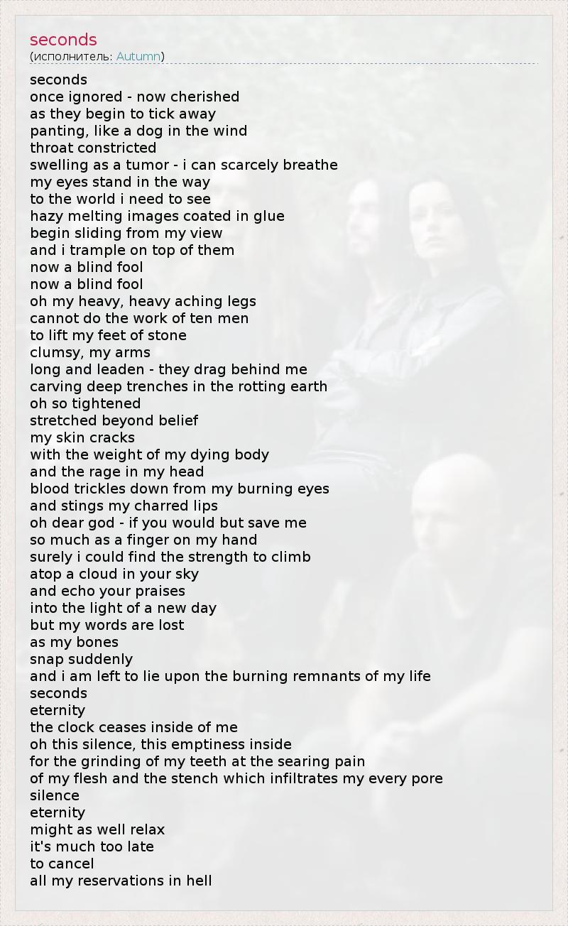 seconds once ignored - now cherished as they begin to tick away panting, like a dog in the wind throat constricted swelling as a tumor - i can scarcely breathe my eyes stand in the way to the world i need to see hazy melting images coated in glue begin sliding from my view and i trample on top of them now a blind fool now a blind fool oh my heavy, heavy aching legs cannot do the work of ten men to lift my feet of stone clumsy, my arms long and leaden - they drag behind me carving deep trenches in the rotting earth oh so tightened stretched beyond belief my skin cracks with the weight of my dying body and the rage in my head blood trickles down from my burning eyes and stings my charred lips oh dear god - if you would but save me so much as a finger on my hand surely i could find the strength to climb atop a cloud in your sky and echo your praises into the light of a new day but my words are lost as my bones snap suddenly and i am left to lie upon the burning remnants of my life seconds eternity the clock ceases inside of me oh this silence, this emptiness inside for the grinding of my teeth at the searing pain of my flesh and the stench which infiltrates my every pore silence eternity might as well relax it's much too late to cancel all my reservations in hell