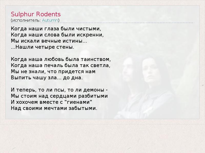 Когда наши глаза были чистыми, Когда наши слова были искренни, Мы искали вечные истины... ...Нашли четыре стены. Когда наша любовь была таинством, Когда наша печаль была так светла, Мы не знали, что придется нам Выпить чашу зла... до дна. И теперь, то ли псы, то ли демоны - Мы стоим над сердцами разбитыми И хохочем вместе с "гиенами" Над своими мечтами забытыми.