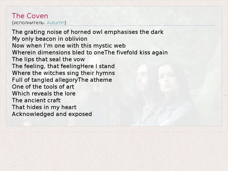 The grating noise of horned owl emphasises the dark My only beacon in oblivion Now when I'm one with this mystic web Wherein dimensions bled to oneThe fivefold kiss again The lips that seal the vow The feeling, that feelingHere I stand Where the witches sing their hymns Full of tangled allegoryThe atheme One of the tools of art Which reveals the lore The ancient craft That hides in my heart Acknowledged and exposed