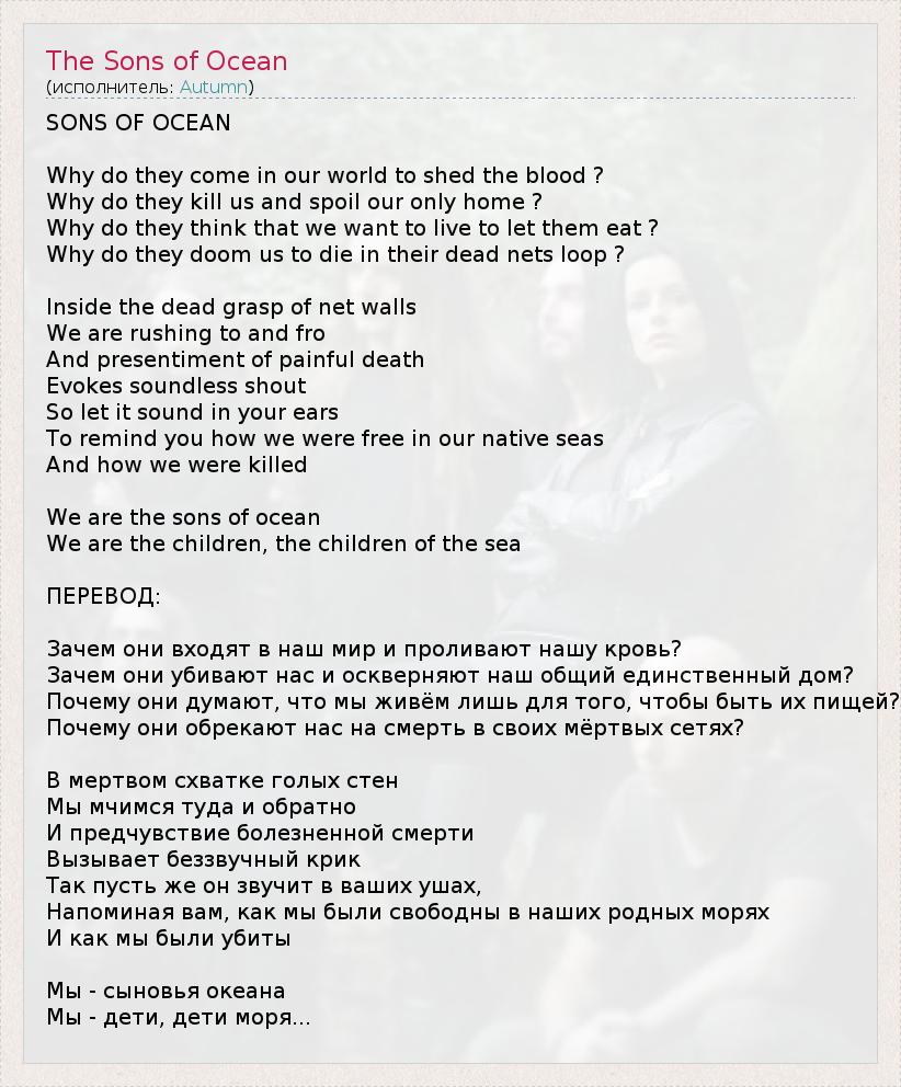 SONS OF OCEAN Why do they come in our world to shed the blood ? Why do they kill us and spoil our only home ? Why do they think that we want to live to let them eat ? Why do they doom us to die in their dead nets loop ? Inside the dead grasp of net walls We are rushing to and fro And presentiment of painful death Evokes soundless shout So let it sound in your ears To remind you how we were free in our native seas And how we were killed We are the sons of ocean We are the children, the children of the sea ПЕРЕВОД: Зачем они входят в наш мир и проливают нашу кровь? Зачем они убивают нас и оскверняют наш общий единственный дом? Почему они думают, что мы живём лишь для того, чтобы быть их пищей? Почему они обрекают нас на смерть в своих мёртвых сетях? В мертвом схватке голых стен Мы мчимся туда и обратно И предчувствие болезненной смерти Вызывает беззвучный крик Так пусть же он звучит в ваших ушах, Напоминая вам, как мы были свободны в наших родных морях И как мы были убиты Мы - сыновья океана Мы - дети, дети моря...