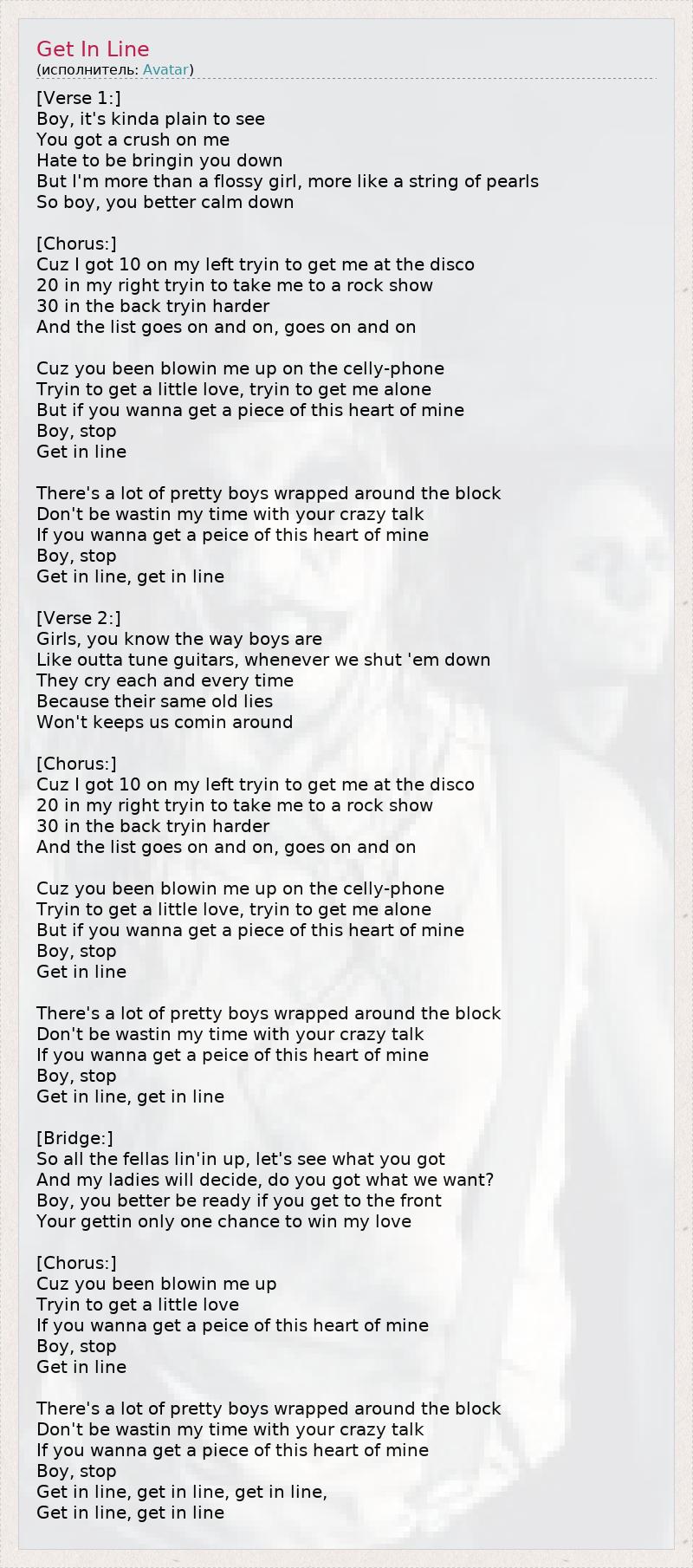 [Verse 1:] Boy, it's kinda plain to see You got a crush on me Hate to be bringin you down But I'm more than a flossy girl, more like a string of pearls So boy, you better calm down [Chorus:] Cuz I got 10 on my left tryin to get me at the disco 20 in my right tryin to take me to a rock show 30 in the back tryin harder And the list goes on and on, goes on and on Cuz you been blowin me up on the celly-phone Tryin to get a little love, tryin to get me alone But if you wanna get a piece of this heart of mine Boy, stop Get in line There's a lot of pretty boys wrapped around the block Don't be wastin my time with your crazy talk If you wanna get a peice of this heart of mine Boy, stop Get in line, get in line [Verse 2:] Girls, you know the way boys are Like outta tune guitars, whenever we shut 'em down They cry each and every time Because their same old lies Won't keeps us comin around [Chorus:] Cuz I got 10 on my left tryin to get me at the disco 20 in my right tryin to take me to a rock show 30 in the back tryin harder And the list goes on and on, goes on and on Cuz you been blowin me up on the celly-phone Tryin to get a little love, tryin to get me alone But if you wanna get a piece of this heart of mine Boy, stop Get in line There's a lot of pretty boys wrapped around the block Don't be wastin my time with your crazy talk If you wanna get a peice of this heart of mine Boy, stop Get in line, get in line [Bridge:] So all the fellas lin'in up, let's see what you got And my ladies will decide, do you got what we want? Boy, you better be ready if you get to the front Your gettin only one chance to win my love [Chorus:] Cuz you been blowin me up Tryin to get a little love If you wanna get a peice of this heart of mine Boy, stop Get in line There's a lot of pretty boys wrapped around the block Don't be wastin my time with your crazy talk If you wanna get a piece of this heart of mine Boy, stop Get in line, get in line, get in line, Get in line, get in line