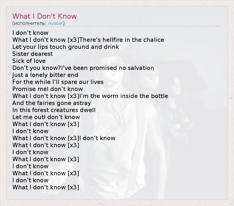 I don't know What I don't know [x3]There's hellfire in the chalice Let your lips touch ground and drink Sister dearest Sick of love Don't you know?I've been promised no salvation Just a lonely bitter end For the while I'll spare our lives Promise meI don't know What I don't know [x3]I'm the worm inside the bottle And the fairies gone astray In this forest creatures dwell Let me outI don't know What I don't know [x3] I don't know What I don't know [x3]I don't know What I don't know [x3] I don't know What I don't know [x3] I don't know What I don't know [x3] I don't know What I don't know [x3]