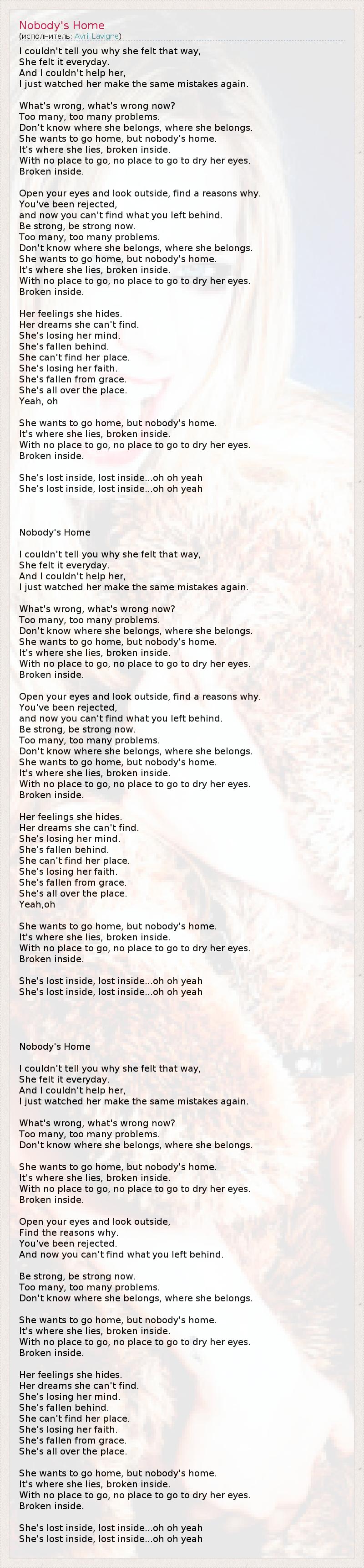 I couldn't tell you why she felt that way, She felt it everyday. And I couldn't help her, I just watched her make the same mistakes again. What's wrong, what's wrong now? Too many, too many problems. Don't know where she belongs, where she belongs. She wants to go home, but nobody's home. It's where she lies, broken inside. With no place to go, no place to go to dry her eyes. Broken inside. Open your eyes and look outside, find a reasons why. You've been rejected, and now you can't find what you left behind. Be strong, be strong now. Too many, too many problems. Don't know where she belongs, where she belongs. She wants to go home, but nobody's home. It's where she lies, broken inside. With no place to go, no place to go to dry her eyes. Broken inside. Her feelings she hides. Her dreams she can't find. She's losing her mind. She's fallen behind. She can't find her place. She's losing her faith. She's fallen from grace. She's all over the place. Yeah, oh She wants to go home, but nobody's home. It's where she lies, broken inside. With no place to go, no place to go to dry her eyes. Broken inside. She's lost inside, lost inside...oh oh yeah She's lost inside, lost inside...oh oh yeah Nobody's Home I couldn't tell you why she felt that way, She felt it everyday. And I couldn't help her, I just watched her make the same mistakes again. What's wrong, what's wrong now? Too many, too many problems. Don't know where she belongs, where she belongs. She wants to go home, but nobody's home. It's where she lies, broken inside. With no place to go, no place to go to dry her eyes. Broken inside. Open your eyes and look outside, find a reasons why. You've been rejected, and now you can't find what you left behind. Be strong, be strong now. Too many, too many problems. Don't know where she belongs, where she belongs. She wants to go home, but nobody's home. It's where she lies, broken inside. With no place to go, no place to go to dry her eyes. Broken inside. Her feelings she hides. Her dreams she can't find. She's losing her mind. She's fallen behind. She can't find her place. She's losing her faith. She's fallen from grace. She's all over the place. Yeah,oh She wants to go home, but nobody's home. It's where she lies, broken inside. With no place to go, no place to go to dry her eyes. Broken inside. She's lost inside, lost inside...oh oh yeah She's lost inside, lost inside...oh oh yeah Nobody's Home I couldn't tell you why she felt that way, She felt it everyday. And I couldn't help her, I just watched her make the same mistakes again. What's wrong, what's wrong now? Too many, too many problems. Don't know where she belongs, where she belongs. She wants to go home, but nobody's home. It's where she lies, broken inside. With no place to go, no place to go to dry her eyes. Broken inside. Open your eyes and look outside, Find the reasons why. You've been rejected. Аnd now you can't find what you left behind. Be strong, be strong now. Too many, too many problems. Don't know where she belongs, where she belongs. She wants to go home, but nobody's home. It's where she lies, broken inside. With no place to go, no place to go to dry her eyes. Broken inside. Her feelings she hides. Her dreams she can't find. She's losing her mind. She's fallen behind. She can't find her place. She's losing her faith. She's fallen from grace. She's all over the place. She wants to go home, but nobody's home. It's where she lies, broken inside. With no place to go, no place to go to dry her eyes. Broken inside. She's lost inside, lost inside...oh oh yeah She's lost inside, lost inside...oh oh yeah