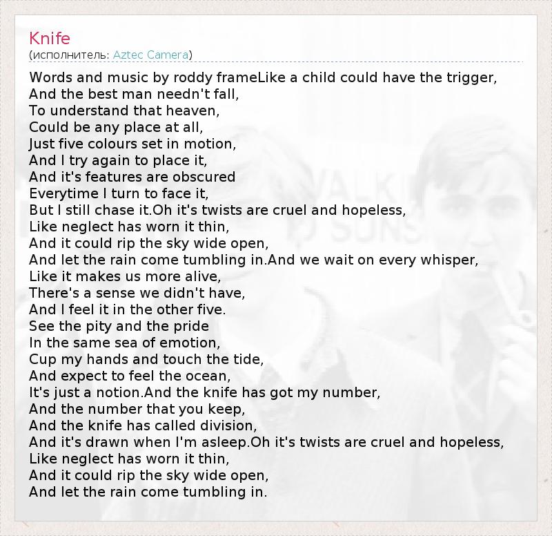 Words and music by roddy frameLike a child could have the trigger, And the best man needn't fall, To understand that heaven, Could be any place at all, Just five colours set in motion, And I try again to place it, And it's features are obscured Everytime I turn to face it, But I still chase it.Oh it's twists are cruel and hopeless, Like neglect has worn it thin, And it could rip the sky wide open, And let the rain come tumbling in.And we wait on every whisper, Like it makes us more alive, There's a sense we didn't have, And I feel it in the other five. See the pity and the pride In the same sea of emotion, Cup my hands and touch the tide, And expect to feel the ocean, It's just a notion.And the knife has got my number, And the number that you keep, And the knife has called division, And it's drawn when I'm asleep.Oh it's twists are cruel and hopeless, Like neglect has worn it thin, And it could rip the sky wide open, And let the rain come tumbling in.
