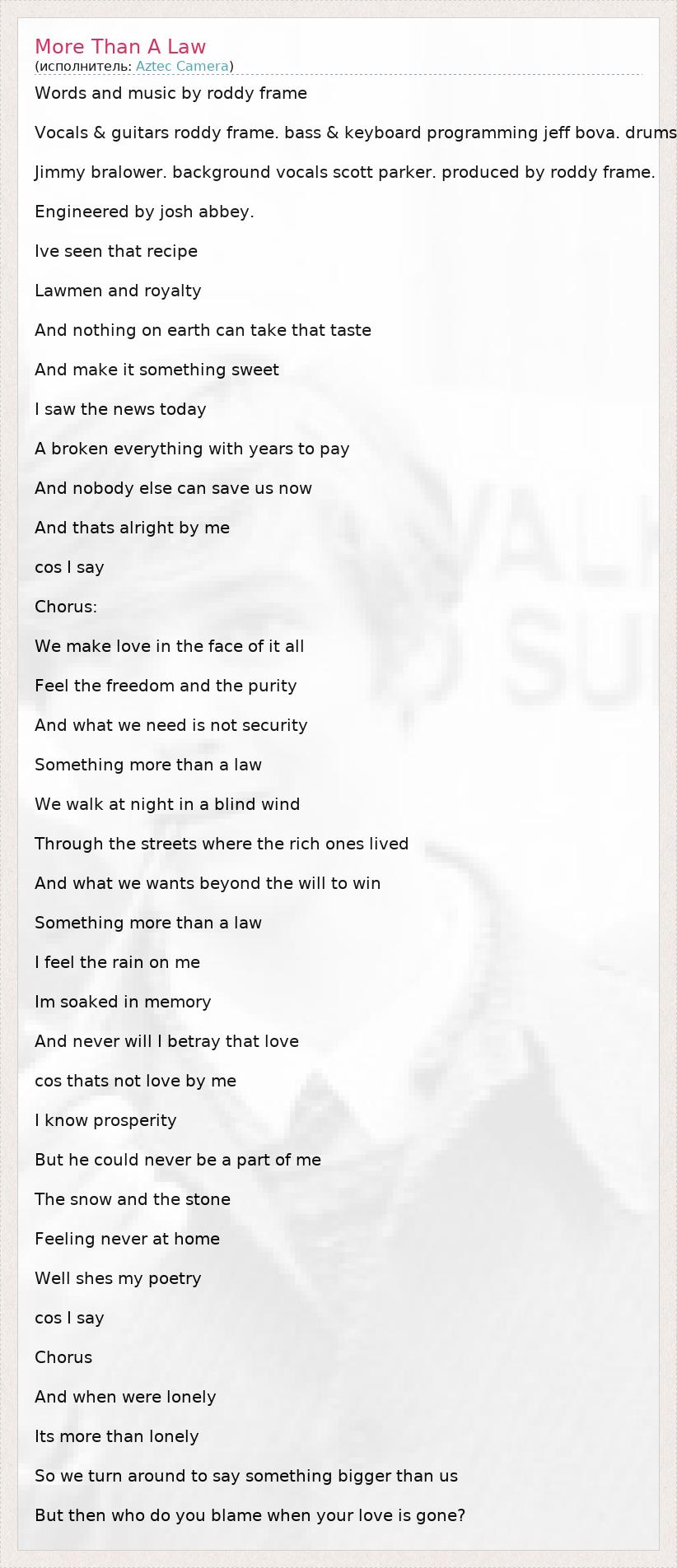 Words and music by roddy frame Vocals & guitars roddy frame. bass & keyboard programming jeff bova. drums Jimmy bralower. background vocals scott parker. produced by roddy frame. Engineered by josh abbey. Ive seen that recipe Lawmen and royalty And nothing on earth can take that taste And make it something sweet I saw the news today A broken everything with years to pay And nobody else can save us now And thats alright by me cos I say Chorus: We make love in the face of it all Feel the freedom and the purity And what we need is not security Something more than a law We walk at night in a blind wind Through the streets where the rich ones lived And what we wants beyond the will to win Something more than a law I feel the rain on me Im soaked in memory And never will I betray that love cos thats not love by me I know prosperity But he could never be a part of me The snow and the stone Feeling never at home Well shes my poetry cos I say Chorus And when were lonely Its more than lonely So we turn around to say something bigger than us But then who do you blame when your love is gone?