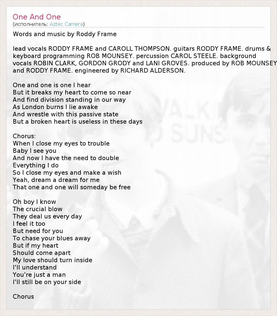 Words and music by Roddy Frame lead vocals RODDY FRAME and CAROLL THOMPSON. guitars RODDY FRAME. drums & keyboard programming ROB MOUNSEY. percussion CAROL STEELE. background vocals ROBIN CLARK, GORDON GRODY and LANI GROVES. produced by ROB MOUNSEY and RODDY FRAME. engineered by RICHARD ALDERSON. One and one is one I hear But it breaks my heart to come so near And find division standing in our way As London burns I lie awake And wrestle with this passive state But a broken heart is useless in these days Chorus: When I close my eyes to trouble Baby I see you And now I have the need to double Everything I do So I close my eyes and make a wish Yeah, dream a dream for me That one and one will someday be free Oh boy I know The crucial blow They deal us every day I feel it too But need for you To chase your blues away But if my heart Should come apart My love should turn inside I'll understand You're just a man I'll still be on your side Chorus