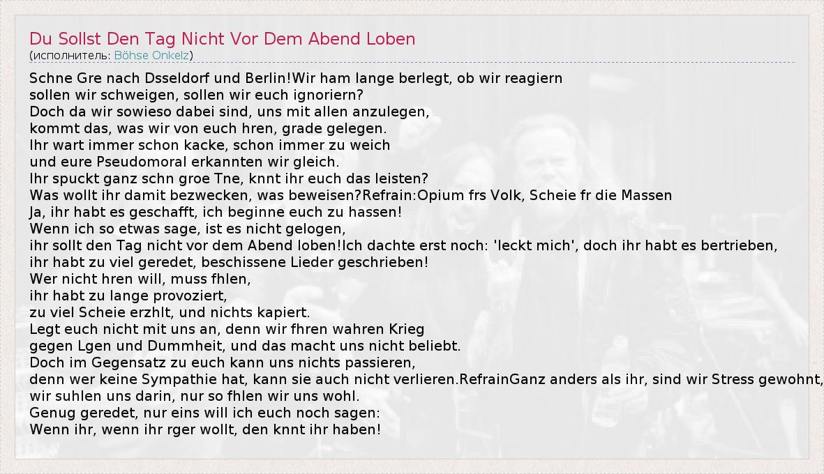 Schne Gre nach Dsseldorf und Berlin!Wir ham lange berlegt, ob wir reagiern sollen wir schweigen, sollen wir euch ignoriern? Doch da wir sowieso dabei sind, uns mit allen anzulegen, kommt das, was wir von euch hren, grade gelegen. Ihr wart immer schon kacke, schon immer zu weich und eure Pseudomoral erkannten wir gleich. Ihr spuckt ganz schn groe Tne, knnt ihr euch das leisten? Was wollt ihr damit bezwecken, was beweisen?Refrain:Opium frs Volk, Scheie fr die Massen Ja, ihr habt es geschafft, ich beginne euch zu hassen! Wenn ich so etwas sage, ist es nicht gelogen, ihr sollt den Tag nicht vor dem Abend loben!Ich dachte erst noch: 'leckt mich', doch ihr habt es bertrieben, ihr habt zu viel geredet, beschissene Lieder geschrieben! Wer nicht hren will, muss fhlen, ihr habt zu lange provoziert, zu viel Scheie erzhlt, und nichts kapiert. Legt euch nicht mit uns an, denn wir fhren wahren Krieg gegen Lgen und Dummheit, und das macht uns nicht beliebt. Doch im Gegensatz zu euch kann uns nichts passieren, denn wer keine Sympathie hat, kann sie auch nicht verlieren.RefrainGanz anders als ihr, sind wir Stress gewohnt, wir suhlen uns darin, nur so fhlen wir uns wohl. Genug geredet, nur eins will ich euch noch sagen: Wenn ihr, wenn ihr rger wollt, den knnt ihr haben!