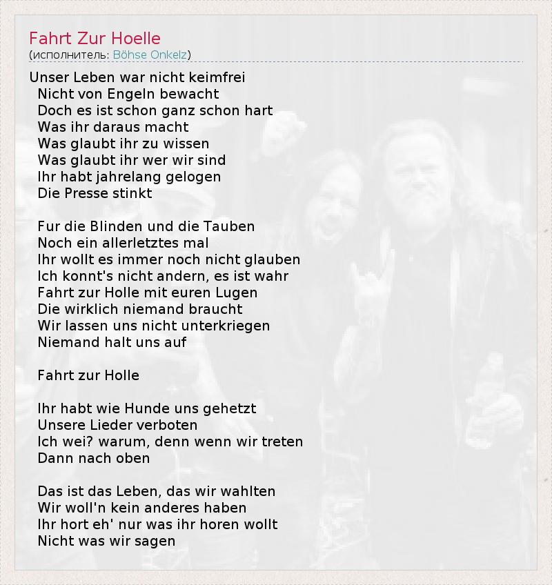 Unser Leben war nicht keimfrei Nicht von Engeln bewacht Doch es ist schon ganz schon hart Was ihr daraus macht Was glaubt ihr zu wissen Was glaubt ihr wer wir sind Ihr habt jahrelang gelogen Die Presse stinkt Fur die Blinden und die Tauben Noch ein allerletztes mal Ihr wollt es immer noch nicht glauben Ich konnt's nicht andern, es ist wahr Fahrt zur Holle mit euren Lugen Die wirklich niemand braucht Wir lassen uns nicht unterkriegen Niemand halt uns auf Fahrt zur Holle Ihr habt wie Hunde uns gehetzt Unsere Lieder verboten Ich wei? warum, denn wenn wir treten Dann nach oben Das ist das Leben, das wir wahlten Wir woll'n kein anderes haben Ihr hort eh' nur was ihr horen wollt Nicht was wir sagen