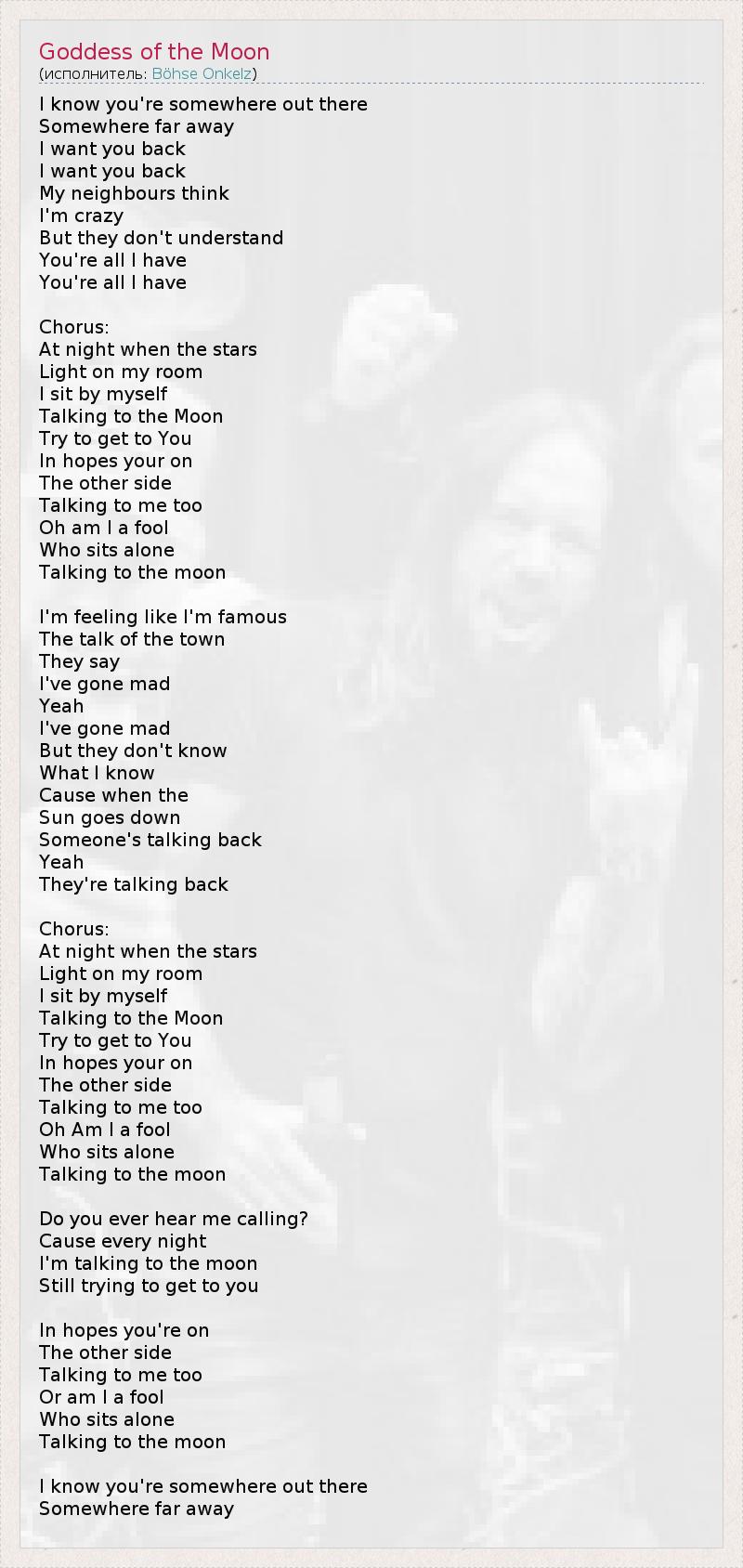 I know you're somewhere out there Somewhere far away I want you back I want you back My neighbours think I'm crazy But they don't understand You're all I have You're all I have Chorus: At night when the stars Light on my room I sit by myself Talking to the Moon Try to get to You In hopes your on The other side Talking to me too Oh am I a fool Who sits alone Talking to the moon I'm feeling like I'm famous The talk of the town They say I've gone mad Yeah I've gone mad But they don't know What I know Cause when the Sun goes down Someone's talking back Yeah They're talking back Chorus: At night when the stars Light on my room I sit by myself Talking to the Moon Try to get to You In hopes your on The other side Talking to me too Oh Am I a fool Who sits alone Talking to the moon Do you ever hear me calling? Cause every night I'm talking to the moon Still trying to get to you In hopes you're on The other side Talking to me too Or am I a fool Who sits alone Talking to the moon I know you're somewhere out there Somewhere far away