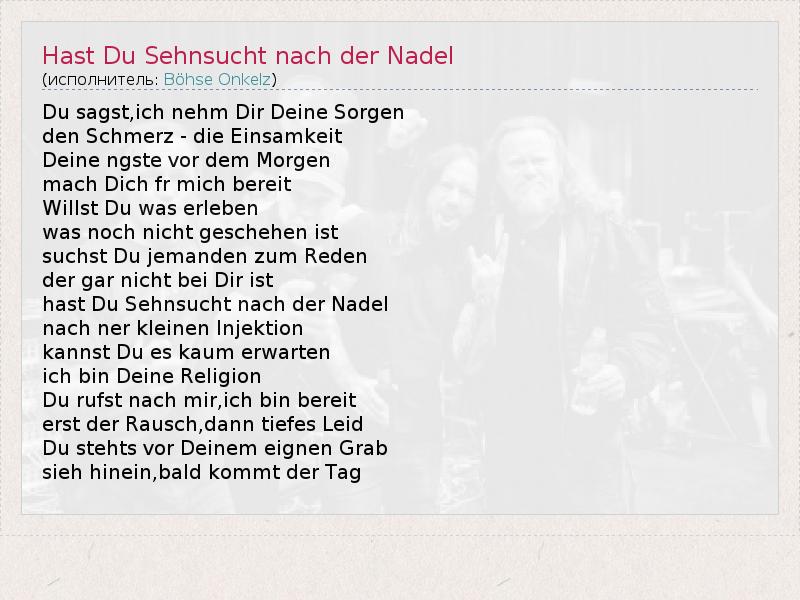 А как ты думаешь, о чем песня "Hast Du Sehnsucht nach der Nadel" ?