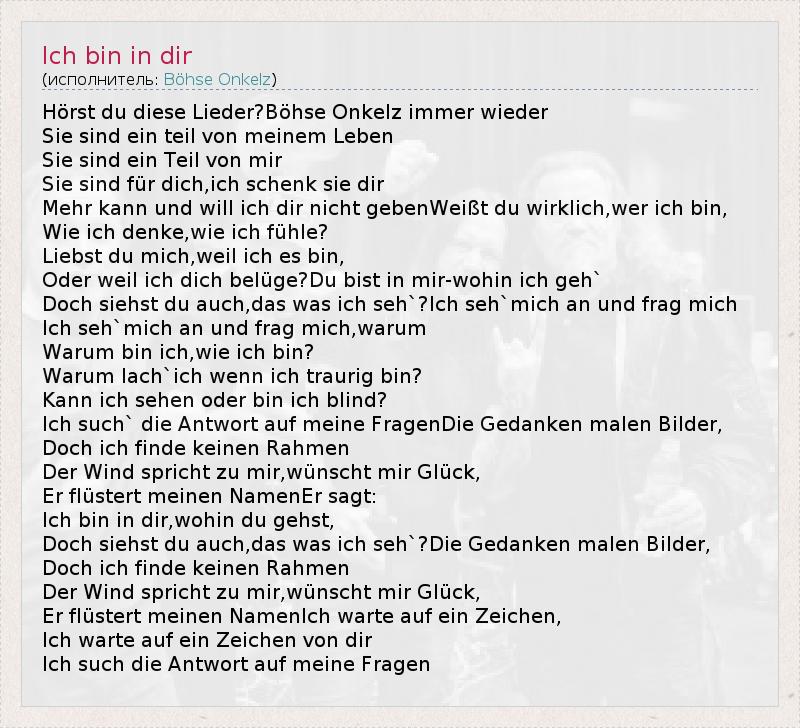 Hörst du diese Lieder?Böhse Onkelz immer wieder Sie sind ein teil von meinem Leben Sie sind ein Teil von mir Sie sind für dich,ich schenk sie dir Mehr kann und will ich dir nicht gebenWeißt du wirklich,wer ich bin, Wie ich denke,wie ich fühle? Liebst du mich,weil ich es bin, Oder weil ich dich belüge?Du bist in mir-wohin ich geh` Doch siehst du auch,das was ich seh`?Ich seh`mich an und frag mich Ich seh`mich an und frag mich,warum Warum bin ich,wie ich bin? Warum lach`ich wenn ich traurig bin? Kann ich sehen oder bin ich blind? Ich such` die Antwort auf meine FragenDie Gedanken malen Bilder, Doch ich finde keinen Rahmen Der Wind spricht zu mir,wünscht mir Glück, Er flüstert meinen NamenEr sagt: Ich bin in dir,wohin du gehst, Doch siehst du auch,das was ich seh`?Die Gedanken malen Bilder, Doch ich finde keinen Rahmen Der Wind spricht zu mir,wünscht mir Glück, Er flüstert meinen NamenIch warte auf ein Zeichen, Ich warte auf ein Zeichen von dir Ich such die Antwort auf meine Fragen