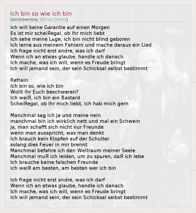 Ich will keine Garantie auf einen Morgen Es ist mir scheiЯegal, ob Ihr mich liebt Ich sehe meine Lьge, ich bin nicht blind geboren Ich lerne aus meinem Fehlern und mache daraus ein Lied Ich frage nicht erst andre, was ich darf Wenn ich an etwas glaube, handle ich danach Ich mache, was ich will, wenn es Freude bringt Ich will jemand sein, der sein Schicksal selbst bestimmt Refrain: Ich bin so, wie ich bin Wollt Ihr Euch beschweren? Ich weiЯ, ich bin ein Bastard ScheiЯegal, ob Ihr mich liebt, ich hab mich gern Manchmal sag ich ja und meine nein manchmal bin ich wirklich nett und mal ein Schwein Ja, man schafft sich nicht nur Freunde wenn man ausspricht, was man denkt Ich brauch kein Klopfen auf der Schulter solang dies Feuer in mir brennt Manchmal befahre ich den Weltraum meiner Seele Manchmal muЯ ich leiden, um zu spьren, daЯ ich lebe Ich brauche keine falschen Freunde ich weiЯ am besten, am besten wer ich bin Ich frage nicht erst andre, was ich darf Wenn ich an etwas glaube, handle ich danach Ich mache, was ich will, wenn es Freude bringt Ich will jemand sein, der sein Schicksal selbst bestimmt