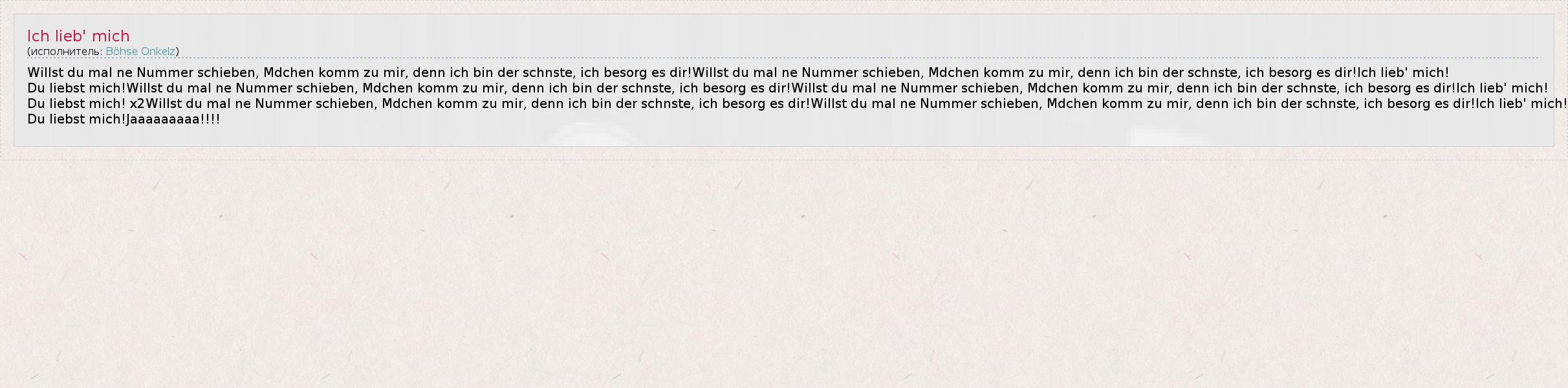 Willst du mal ne Nummer schieben, Mdchen komm zu mir, denn ich bin der schnste, ich besorg es dir!Willst du mal ne Nummer schieben, Mdchen komm zu mir, denn ich bin der schnste, ich besorg es dir!Ich lieb' mich! Du liebst mich!Willst du mal ne Nummer schieben, Mdchen komm zu mir, denn ich bin der schnste, ich besorg es dir!Willst du mal ne Nummer schieben, Mdchen komm zu mir, denn ich bin der schnste, ich besorg es dir!Ich lieb' mich! Du liebst mich! x2Willst du mal ne Nummer schieben, Mdchen komm zu mir, denn ich bin der schnste, ich besorg es dir!Willst du mal ne Nummer schieben, Mdchen komm zu mir, denn ich bin der schnste, ich besorg es dir!Ich lieb' mich! Du liebst mich!Jaaaaaaaaa!!!!