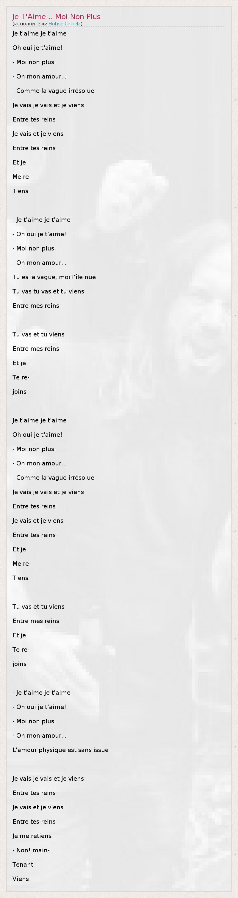 Je t'aime je t'aime Oh oui je t'aime! - Moi non plus. - Oh mon amour... - Comme la vague irrésolue Je vais je vais et je viens Entre tes reins Je vais et je viens Entre tes reins Et je Me re- Tiens - Je t'aime je t'aime - Oh oui je t'aime! - Moi non plus. - Oh mon amour... Tu es la vague, moi l'île nue Tu vas tu vas et tu viens Entre mes reins Tu vas et tu viens Entre mes reins Et je Te re- joins Je t'aime je t'aime Oh oui je t'aime! - Moi non plus. - Oh mon amour... - Comme la vague irrésolue Je vais je vais et je viens Entre tes reins Je vais et je viens Entre tes reins Et je Me re- Tiens Tu vas et tu viens Entre mes reins Et je Te re- joins - Je t'aime je t'aime - Oh oui je t'aime! - Moi non plus. - Oh mon amour... L'amour physique est sans issue Je vais je vais et je viens Entre tes reins Je vais et je viens Entre tes reins Je me retiens - Non! main- Tenant Viens!
