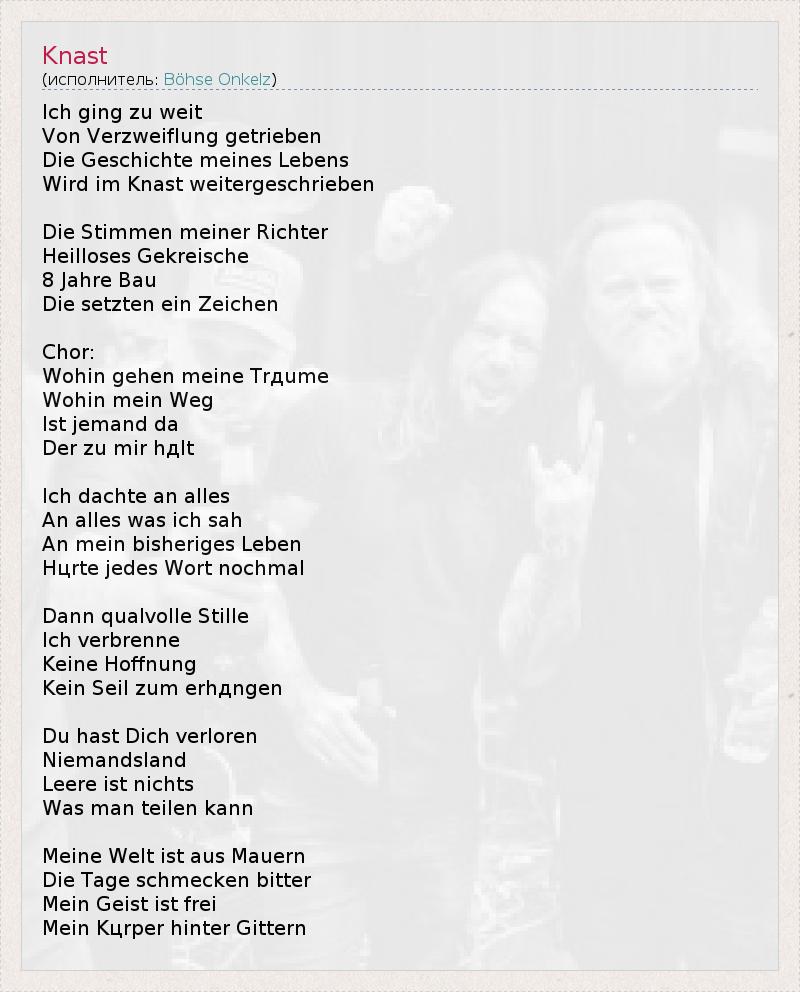 Ich ging zu weit Von Verzweiflung getrieben Die Geschichte meines Lebens Wird im Knast weitergeschrieben Die Stimmen meiner Richter Heilloses Gekreische 8 Jahre Bau Die setzten ein Zeichen Chor: Wohin gehen meine Trдume Wohin mein Weg Ist jemand da Der zu mir hдlt Ich dachte an alles An alles was ich sah An mein bisheriges Leben Hцrte jedes Wort nochmal Dann qualvolle Stille Ich verbrenne Keine Hoffnung Kein Seil zum erhдngen Du hast Dich verloren Niemandsland Leere ist nichts Was man teilen kann Meine Welt ist aus Mauern Die Tage schmecken bitter Mein Geist ist frei Mein Kцrper hinter Gittern