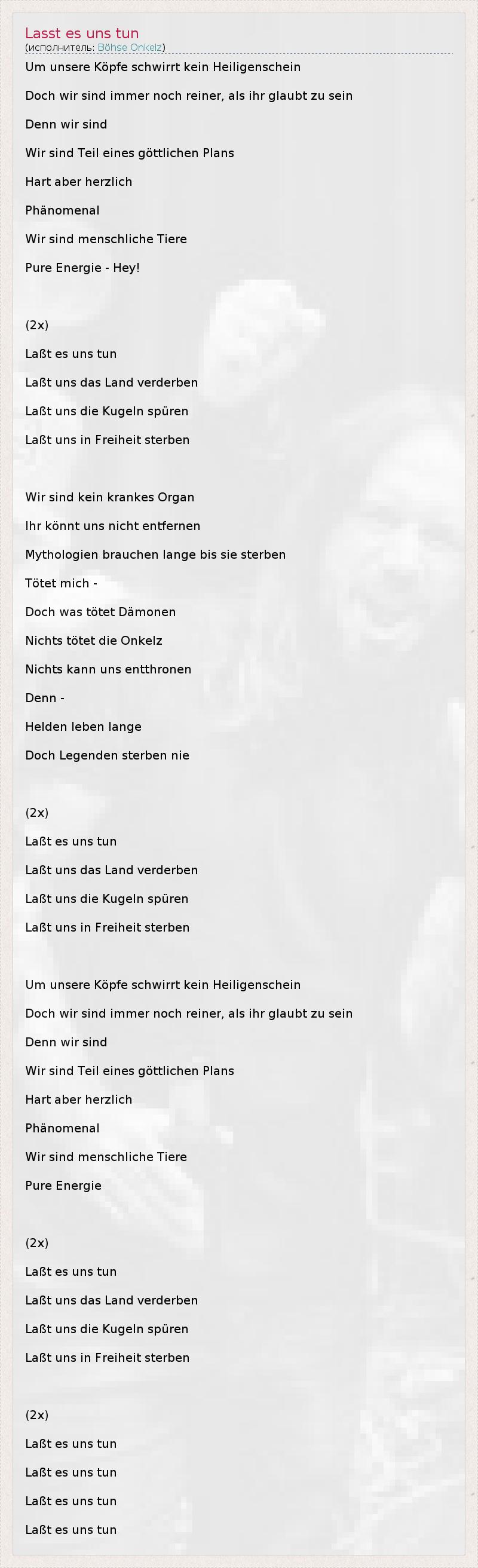 Um unsere Köpfe schwirrt kein Heiligenschein Doch wir sind immer noch reiner, als ihr glaubt zu sein Denn wir sind Wir sind Teil eines göttlichen Plans Hart aber herzlich Phänomenal Wir sind menschliche Tiere Pure Energie - Hey! (2x) Laßt es uns tun Laßt uns das Land verderben Laßt uns die Kugeln spüren Laßt uns in Freiheit sterben Wir sind kein krankes Organ Ihr könnt uns nicht entfernen Mythologien brauchen lange bis sie sterben Tötet mich - Doch was tötet Dämonen Nichts tötet die Onkelz Nichts kann uns entthronen Denn - Helden leben lange Doch Legenden sterben nie (2x) Laßt es uns tun Laßt uns das Land verderben Laßt uns die Kugeln spüren Laßt uns in Freiheit sterben Um unsere Köpfe schwirrt kein Heiligenschein Doch wir sind immer noch reiner, als ihr glaubt zu sein Denn wir sind Wir sind Teil eines göttlichen Plans Hart aber herzlich Phänomenal Wir sind menschliche Tiere Pure Energie (2x) Laßt es uns tun Laßt uns das Land verderben Laßt uns die Kugeln spüren Laßt uns in Freiheit sterben (2x) Laßt es uns tun Laßt es uns tun Laßt es uns tun Laßt es uns tun