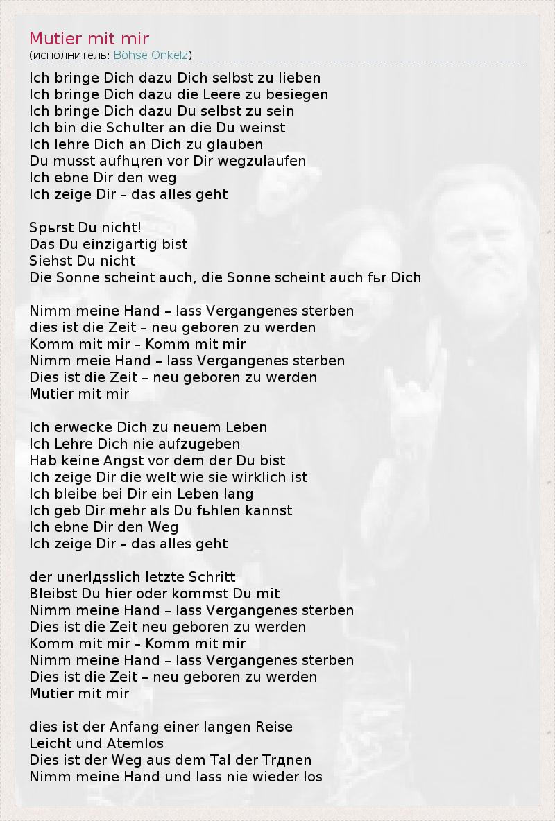 Ich bringe Dich dazu Dich selbst zu lieben Ich bringe Dich dazu die Leere zu besiegen Ich bringe Dich dazu Du selbst zu sein Ich bin die Schulter an die Du weinst Ich lehre Dich an Dich zu glauben Du musst aufhцren vor Dir wegzulaufen Ich ebne Dir den weg Ich zeige Dir – das alles geht Spьrst Du nicht! Das Du einzigartig bist Siehst Du nicht Die Sonne scheint auch, die Sonne scheint auch fьr Dich Nimm meine Hand – lass Vergangenes sterben dies ist die Zeit – neu geboren zu werden Komm mit mir – Komm mit mir Nimm meie Hand – lass Vergangenes sterben Dies ist die Zeit – neu geboren zu werden Mutier mit mir Ich erwecke Dich zu neuem Leben Ich Lehre Dich nie aufzugeben Hab keine Angst vor dem der Du bist Ich zeige Dir die welt wie sie wirklich ist Ich bleibe bei Dir ein Leben lang Ich geb Dir mehr als Du fьhlen kannst Ich ebne Dir den Weg Ich zeige Dir – das alles geht der unerlдsslich letzte Schritt Bleibst Du hier oder kommst Du mit Nimm meine Hand – lass Vergangenes sterben Dies ist die Zeit neu geboren zu werden Komm mit mir – Komm mit mir Nimm meine Hand – lass Vergangenes sterben Dies ist die Zeit – neu geboren zu werden Mutier mit mir dies ist der Anfang einer langen Reise Leicht und Atemlos Dies ist der Weg aus dem Tal der Trдnen Nimm meine Hand und lass nie wieder los