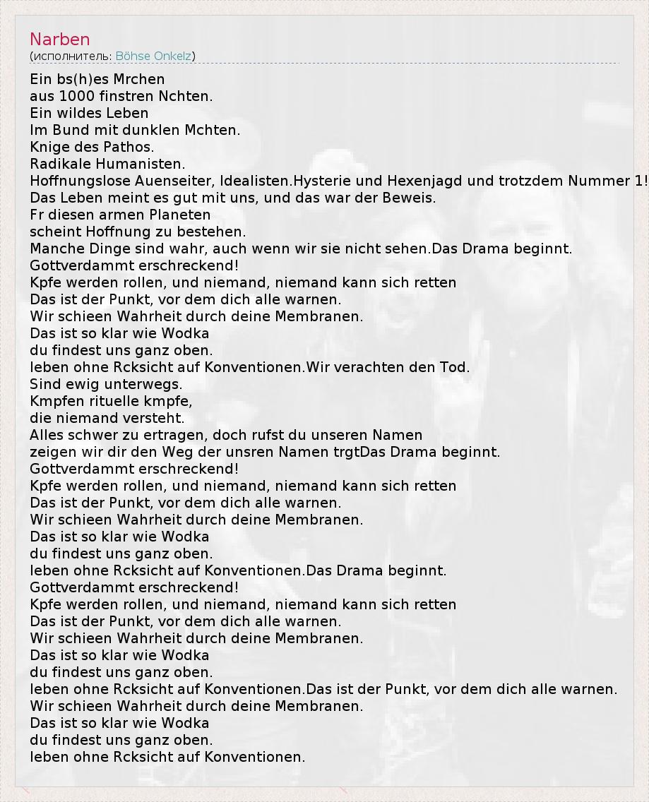 Ein bs(h)es Mrchen aus 1000 finstren Nchten. Ein wildes Leben Im Bund mit dunklen Mchten. Knige des Pathos. Radikale Humanisten. Hoffnungslose Auenseiter, Idealisten.Hysterie und Hexenjagd und trotzdem Nummer 1! Das Leben meint es gut mit uns, und das war der Beweis. Fr diesen armen Planeten scheint Hoffnung zu bestehen. Manche Dinge sind wahr, auch wenn wir sie nicht sehen.Das Drama beginnt. Gottverdammt erschreckend! Kpfe werden rollen, und niemand, niemand kann sich retten Das ist der Punkt, vor dem dich alle warnen. Wir schieen Wahrheit durch deine Membranen. Das ist so klar wie Wodka du findest uns ganz oben. leben ohne Rcksicht auf Konventionen.Wir verachten den Tod. Sind ewig unterwegs. Kmpfen rituelle kmpfe, die niemand versteht. Alles schwer zu ertragen, doch rufst du unseren Namen zeigen wir dir den Weg der unsren Namen trgtDas Drama beginnt. Gottverdammt erschreckend! Kpfe werden rollen, und niemand, niemand kann sich retten Das ist der Punkt, vor dem dich alle warnen. Wir schieen Wahrheit durch deine Membranen. Das ist so klar wie Wodka du findest uns ganz oben. leben ohne Rcksicht auf Konventionen.Das Drama beginnt. Gottverdammt erschreckend! Kpfe werden rollen, und niemand, niemand kann sich retten Das ist der Punkt, vor dem dich alle warnen. Wir schieen Wahrheit durch deine Membranen. Das ist so klar wie Wodka du findest uns ganz oben. leben ohne Rcksicht auf Konventionen.Das ist der Punkt, vor dem dich alle warnen. Wir schieen Wahrheit durch deine Membranen. Das ist so klar wie Wodka du findest uns ganz oben. leben ohne Rcksicht auf Konventionen.