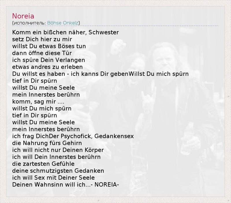 Komm ein bißchen näher, Schwester setz Dich hier zu mir willst Du etwas Böses tun dann öffne diese Tür ich spüre Dein Verlangen etwas andres zu erleben Du willst es haben - ich kanns Dir gebenWillst Du mich spürn tief in Dir spürn willst Du meine Seele mein Innerstes berührn komm, sag mir .... willst Du mich spürn tief in Dir spürn willst Du meine Seele mein Innerstes berührn ich frag DichDer Psychofick, Gedankensex die Nahrung fürs Gehirn ich will nicht nur Deinen Körper ich will Dein Innerstes berührn die zartesten Gefühle deine schmutzigsten Gedanken ich will Sex mit Deiner Seele Deinen Wahnsinn will ich...- NOREIA-