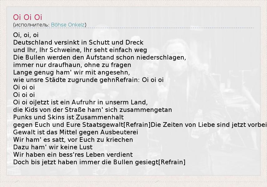 Oi, oi, oi Deutschland versinkt in Schutt und Dreck und Ihr, Ihr Schweine, Ihr seht einfach weg Die Bullen werden den Aufstand schon niederschlagen, immer nur draufhaun, ohne zu fragen Lange genug ham' wir mit angesehn, wie unsre Städte zugrunde gehnRefrain: Oi oi oi Oi oi oi Oi oi oi Oi oi oiJetzt ist ein Aufruhr in unserm Land, die Kids von der Straße ham' sich zusammengetan Punks und Skins ist Zusammenhalt gegen Euch und Eure Staatsgewalt[Refrain]Die Zeiten von Liebe sind jetzt vorbei Gewalt ist das Mittel gegen Ausbeuterei Wir ham' es satt, vor Euch zu kriechen Dazu ham' wir keine Lust Wir haben ein bess'res Leben verdient Doch bis jetzt haben immer die Bullen gesiegt[Refrain]