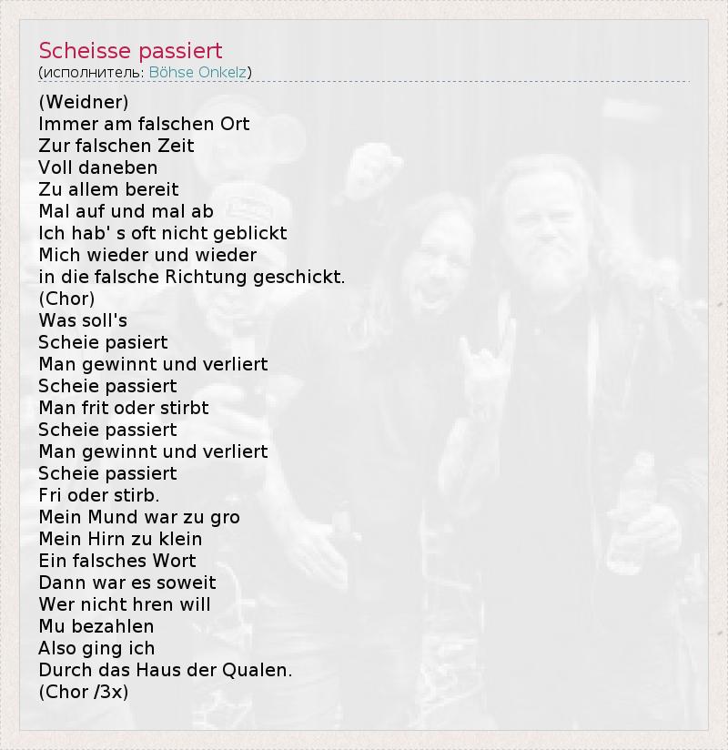 (Weidner) Immer am falschen Ort Zur falschen Zeit Voll daneben Zu allem bereit Mal auf und mal ab Ich hab' s oft nicht geblickt Mich wieder und wieder in die falsche Richtung geschickt. (Chor) Was soll's Scheie pasiert Man gewinnt und verliert Scheie passiert Man frit oder stirbt Scheie passiert Man gewinnt und verliert Scheie passiert Fri oder stirb. Mein Mund war zu gro Mein Hirn zu klein Ein falsches Wort Dann war es soweit Wer nicht hren will Mu bezahlen Also ging ich Durch das Haus der Qualen. (Chor /3x)