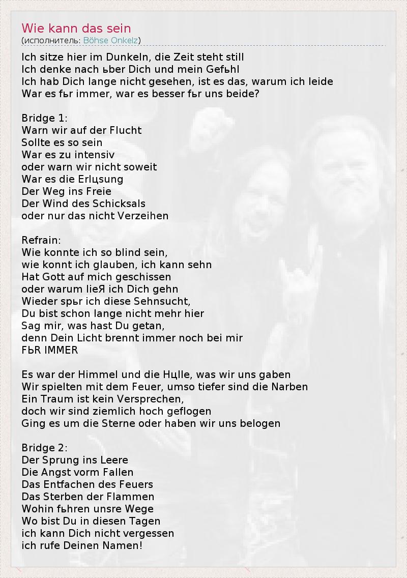 Ich sitze hier im Dunkeln, die Zeit steht still Ich denke nach ьber Dich und mein Gefьhl Ich hab Dich lange nicht gesehen, ist es das, warum ich leide War es fьr immer, war es besser fьr uns beide? Bridge 1: Warn wir auf der Flucht Sollte es so sein War es zu intensiv oder warn wir nicht soweit War es die Erlцsung Der Weg ins Freie Der Wind des Schicksals oder nur das nicht Verzeihen Refrain: Wie konnte ich so blind sein, wie konnt ich glauben, ich kann sehn Hat Gott auf mich geschissen oder warum lieЯ ich Dich gehn Wieder spьr ich diese Sehnsucht, Du bist schon lange nicht mehr hier Sag mir, was hast Du getan, denn Dein Licht brennt immer noch bei mir FЬR IMMER Es war der Himmel und die Hцlle, was wir uns gaben Wir spielten mit dem Feuer, umso tiefer sind die Narben Ein Traum ist kein Versprechen, doch wir sind ziemlich hoch geflogen Ging es um die Sterne oder haben wir uns belogen Bridge 2: Der Sprung ins Leere Die Angst vorm Fallen Das Entfachen des Feuers Das Sterben der Flammen Wohin fьhren unsre Wege Wo bist Du in diesen Tagen ich kann Dich nicht vergessen ich rufe Deinen Namen!