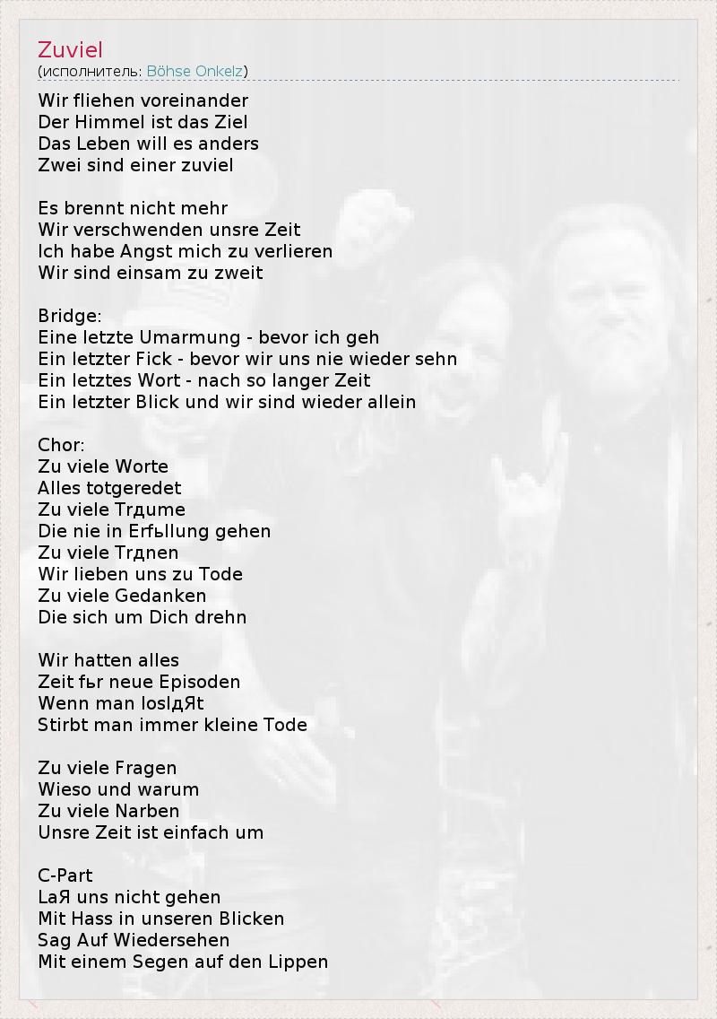 Wir fliehen voreinander Der Himmel ist das Ziel Das Leben will es anders Zwei sind einer zuviel Es brennt nicht mehr Wir verschwenden unsre Zeit Ich habe Angst mich zu verlieren Wir sind einsam zu zweit Bridge: Eine letzte Umarmung - bevor ich geh Ein letzter Fick - bevor wir uns nie wieder sehn Ein letztes Wort - nach so langer Zeit Ein letzter Blick und wir sind wieder allein Chor: Zu viele Worte Alles totgeredet Zu viele Trдume Die nie in Erfьllung gehen Zu viele Trдnen Wir lieben uns zu Tode Zu viele Gedanken Die sich um Dich drehn Wir hatten alles Zeit fьr neue Episoden Wenn man loslдЯt Stirbt man immer kleine Tode Zu viele Fragen Wieso und warum Zu viele Narben Unsre Zeit ist einfach um C-Part LaЯ uns nicht gehen Mit Hass in unseren Blicken Sag Auf Wiedersehen Mit einem Segen auf den Lippen