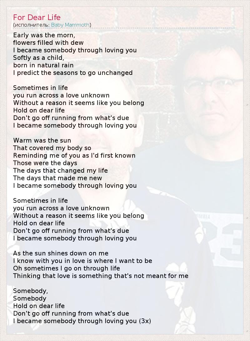 Утро было ранним, Цветы наполнились росой, Я стал "кем-то" благодаря любви к тебе... Мягко, как ребенок, Родившийся в естественном дожде, Я предсказываю неизменные сезоны Иногда в жизни Ты натыкаешься на неизвестную любовь, И тебе беспричинно кажется, что это Твоё. Держись, дорогая жизнь, Не бегай от того, чему всё равно быть, Я стал "кем-то" благодаря любви к тебе... То теплое солнце, Покрывшее моё тело, Напомнило мне о тебе той, которую я впервые узнал. То были дни, Дни, которые изменили мою жизнь, Дни, когда я почувствовал себя заново родившимся, Я стал "кем-то" благодаря любви к тебе... Иногда в жизни Ты натыкаешься на неизвестную любовь, И тебе беспричинно кажется, что это Твоё. Держись, дорогая жизнь, Не бегай от того, чему всё равно быть, Я стал "кем-то" благодаря любви к тебе... Так же, как то, что солнце светит на меня, Я знаю, что хочу быть влюблённым в тебя. Иногда я продолжаю идти по жизни, Думая, что любовь – это нечто, предназначенное не для меня. Кое-кто, Кое-кто, Держись, дорогая жизнь, Не бегай от того, чему всё равно быть. Я стал "кем-то" благодаря любви к тебе... (3 раза)